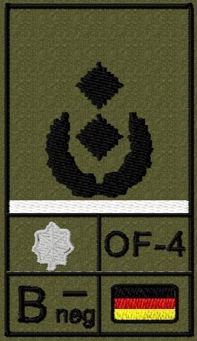 Dienstgradabzeichen auf Klett mit NATO-Rangcode, dem US Army-Dienstgrad, der Deutschlandflagge und der Blutgruppe mit Rhesusfaktor aufgestickt. Passt ideal auf das BW Unterhemd mit Klett auf der Brust oder auch auf dem Smock. Der Patch hat die Maße: B: 5,2cm x L: 9,3cm. Achtung: Bei der Auswahl der