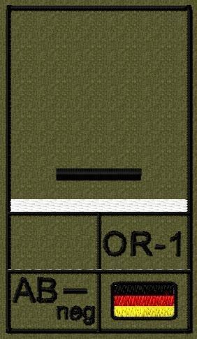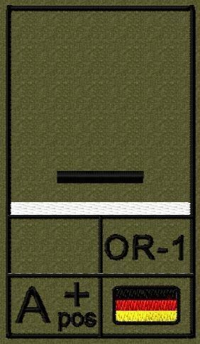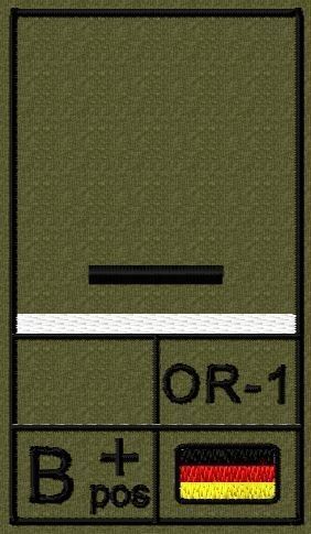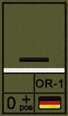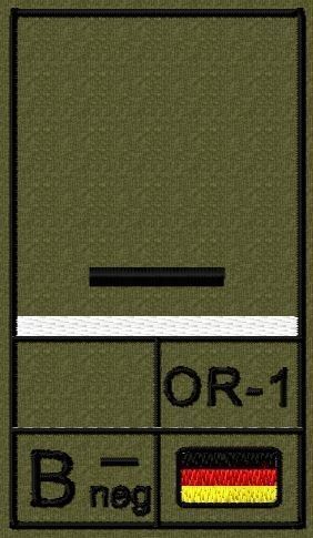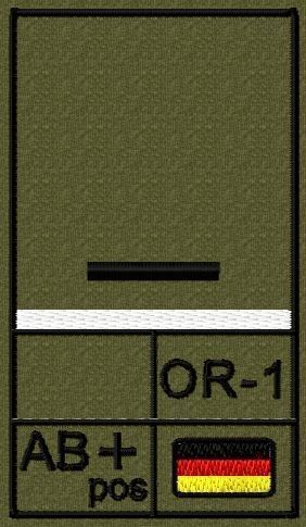 Dienstgradabzeichen auf Klett mit NATO-Rangcode, dem US Army-Dienstgrad, der Deutschlandflagge und der Blutgruppe mit Rhesusfaktor aufgestickt. Passt ideal auf das BW Unterhemd mit Klett auf der Brust oder auch auf dem Smock. Der Patch hat die Maße: B: 5,2cm x L: 9,3cm. Achtung: Bei der Auswahl der