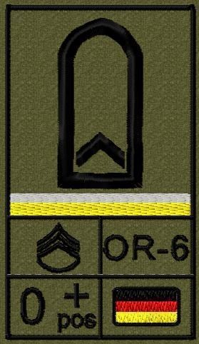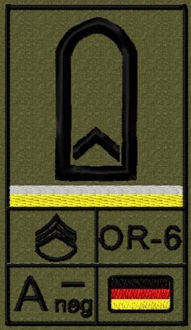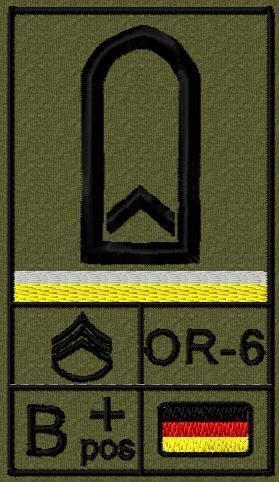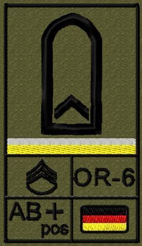 Dienstgradabzeichen auf Klett mit NATO-Rangcode, dem US Army-Dienstgrad, der Deutschlandflagge und der Blutgruppe mit Rhesusfaktor aufgestickt. Passt ideal auf das BW Unterhemd mit Klett auf der Brust oder auch auf dem Smock. Der Patch hat die Maße: B: 5,2cm x L: 9,3cm. Achtung: Bei der Auswahl der