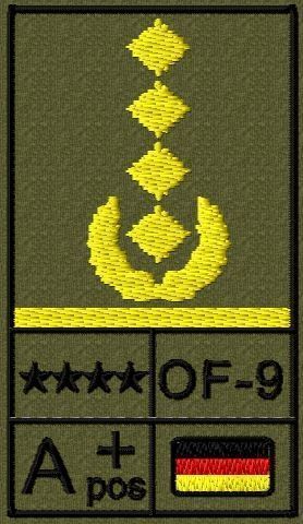 Dienstgradabzeichen auf Klett mit NATO-Rangcode, dem US Army-Dienstgrad, der Deutschlandflagge und der Blutgruppe mit Rhesusfaktor aufgestickt. Passt ideal auf das BW Unterhemd mit Klett auf der Brust oder auch auf dem Smock. Der Patch hat die Maße: B: 5,2cm x L: 9,3cm. Achtung: Bei der Auswahl der