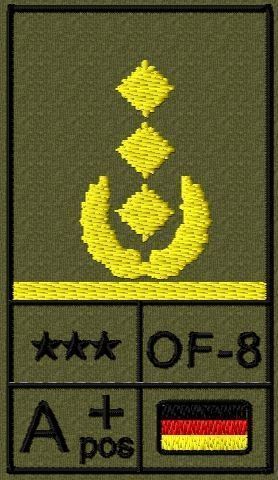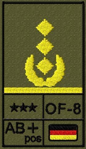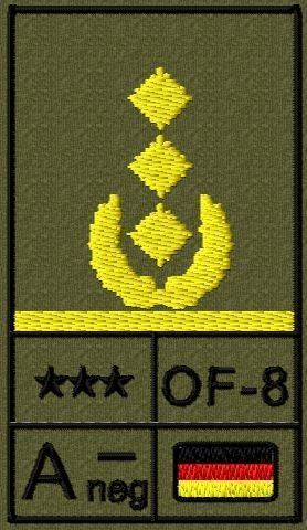 Dienstgradabzeichen auf Klett mit NATO-Rangcode, dem US Army-Dienstgrad, der Deutschlandflagge und der Blutgruppe mit Rhesusfaktor aufgestickt. Passt ideal auf das BW Unterhemd mit Klett auf der Brust oder auch auf dem Smock. Der Patch hat die Maße: B: 5,2cm x L: 9,3cm. Achtung: Bei der Auswahl der