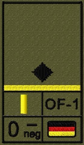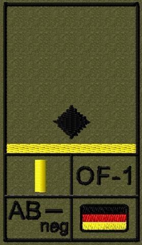 Dienstgradabzeichen auf Klett mit NATO-Rangcode, dem US Army-Dienstgrad, der Deutschlandflagge und der Blutgruppe mit Rhesusfaktor aufgestickt. Passt ideal auf das BW Unterhemd mit Klett auf der Brust oder auch auf dem Smock. Der Patch hat die Maße: B: 5,2cm x L: 9,3cm. Achtung: Bei der Auswahl der