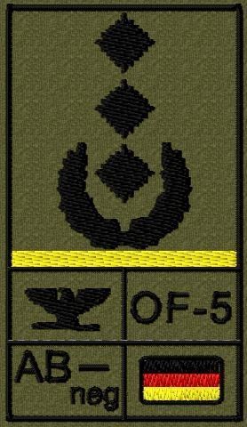 Dienstgradabzeichen auf Klett mit NATO-Rangcode, dem US Army-Dienstgrad, der Deutschlandflagge und der Blutgruppe mit Rhesusfaktor aufgestickt. Passt ideal auf das BW Unterhemd mit Klett auf der Brust oder auch auf dem Smock. Der Patch hat die Maße: B: 5,2cm x L: 9,3cm. Achtung: Bei der Auswahl der