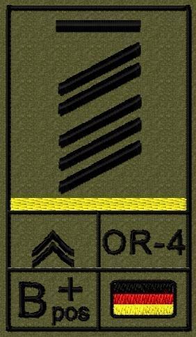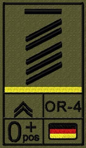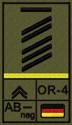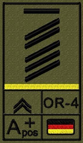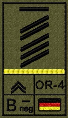 Dienstgradabzeichen auf Klett mit NATO-Rangcode, dem US Army-Dienstgrad, der Deutschlandflagge und der Blutgruppe mit Rhesusfaktor aufgestickt. Passt ideal auf das BW Unterhemd mit Klett auf der Brust oder auch auf dem Smock. Der Patch hat die Maße: B: 5,2cm x L: 9,3cm. Achtung: Bei der Auswahl der