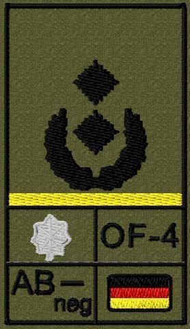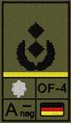Dienstgradabzeichen auf Klett mit NATO-Rangcode, dem US Army-Dienstgrad, der Deutschlandflagge und der Blutgruppe mit Rhesusfaktor aufgestickt. Passt ideal auf das BW Unterhemd mit Klett auf der Brust oder auch auf dem Smock. Der Patch hat die Maße: B: 5,2cm x L: 9,3cm. Achtung: Bei der Auswahl der