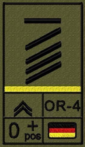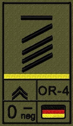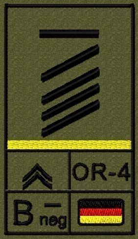 Dienstgradabzeichen auf Klett mit NATO-Rangcode, dem US Army-Dienstgrad, der Deutschlandflagge und der Blutgruppe mit Rhesusfaktor aufgestickt. Passt ideal auf das BW Unterhemd mit Klett auf der Brust oder auch auf dem Smock. Der Patch hat die Maße: B: 5,2cm x L: 9,3cm. Achtung: Bei der Auswahl der