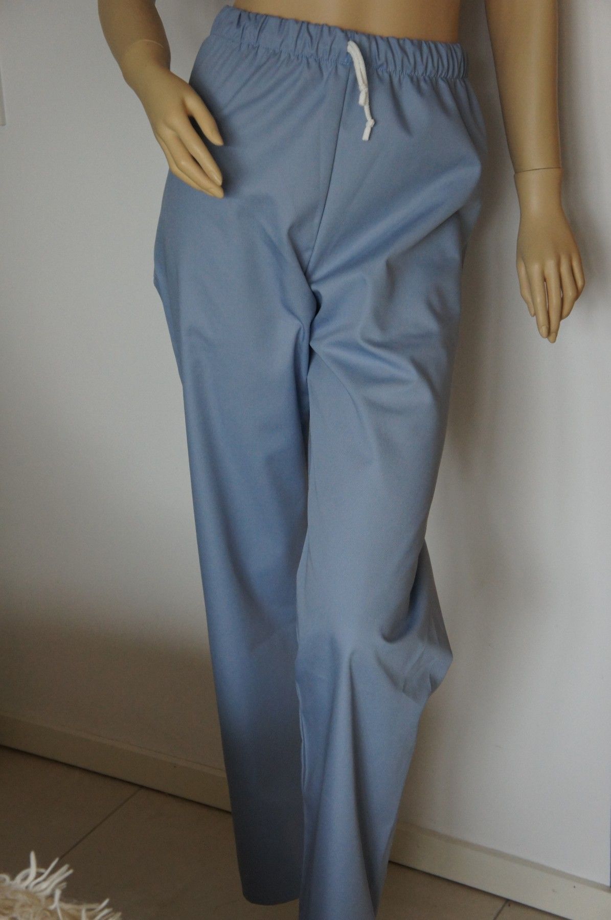 Damen- sowie Herrenhose, Art. Claudia rundum Gummizug mit Kordel, gerade geschnitten, 1 Gesäßtasche Gewebe: 65% Polyester/35% Baumwolle Farbe: pastel blaugrau ACHTUNG: Größentabelle beachten!