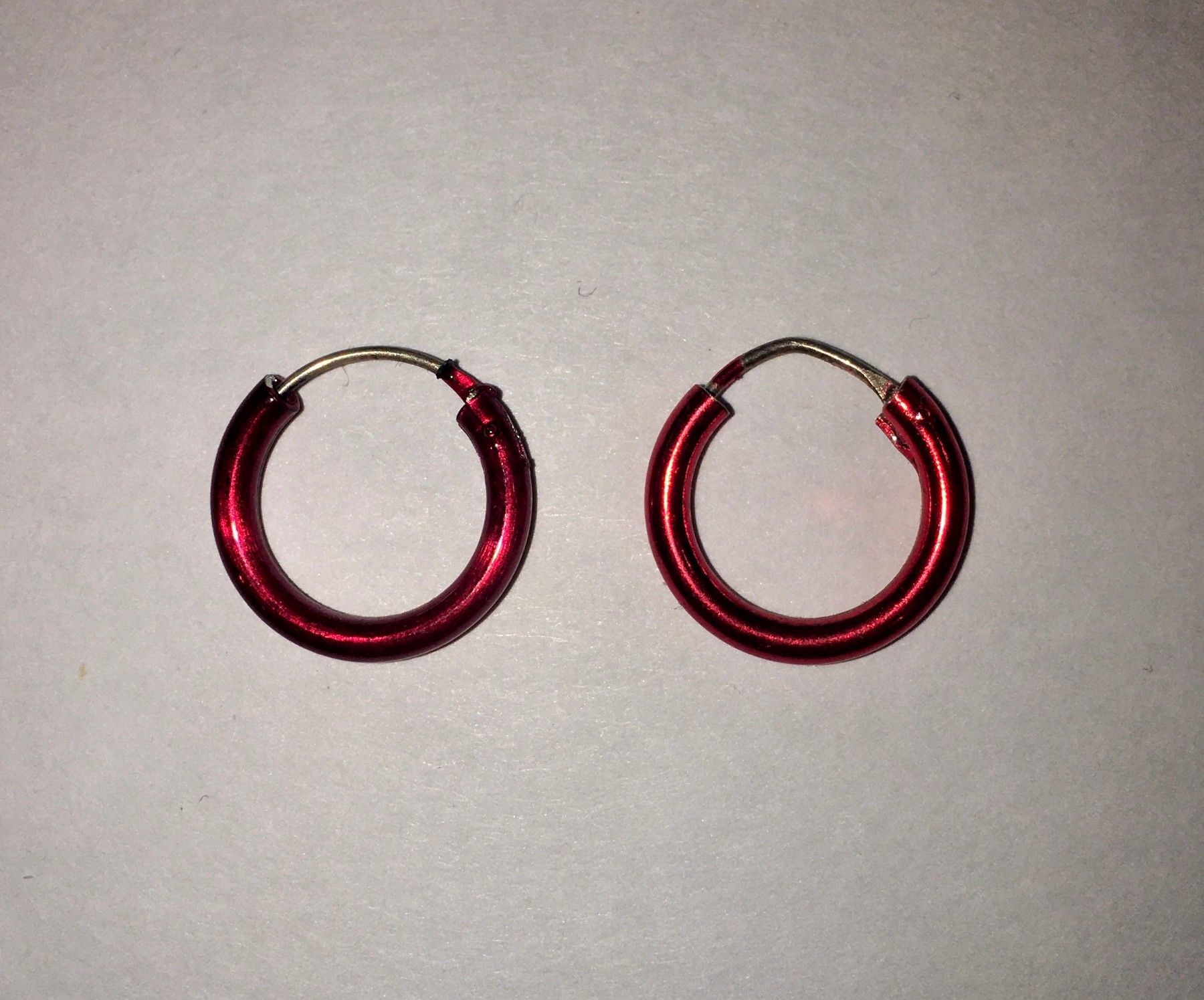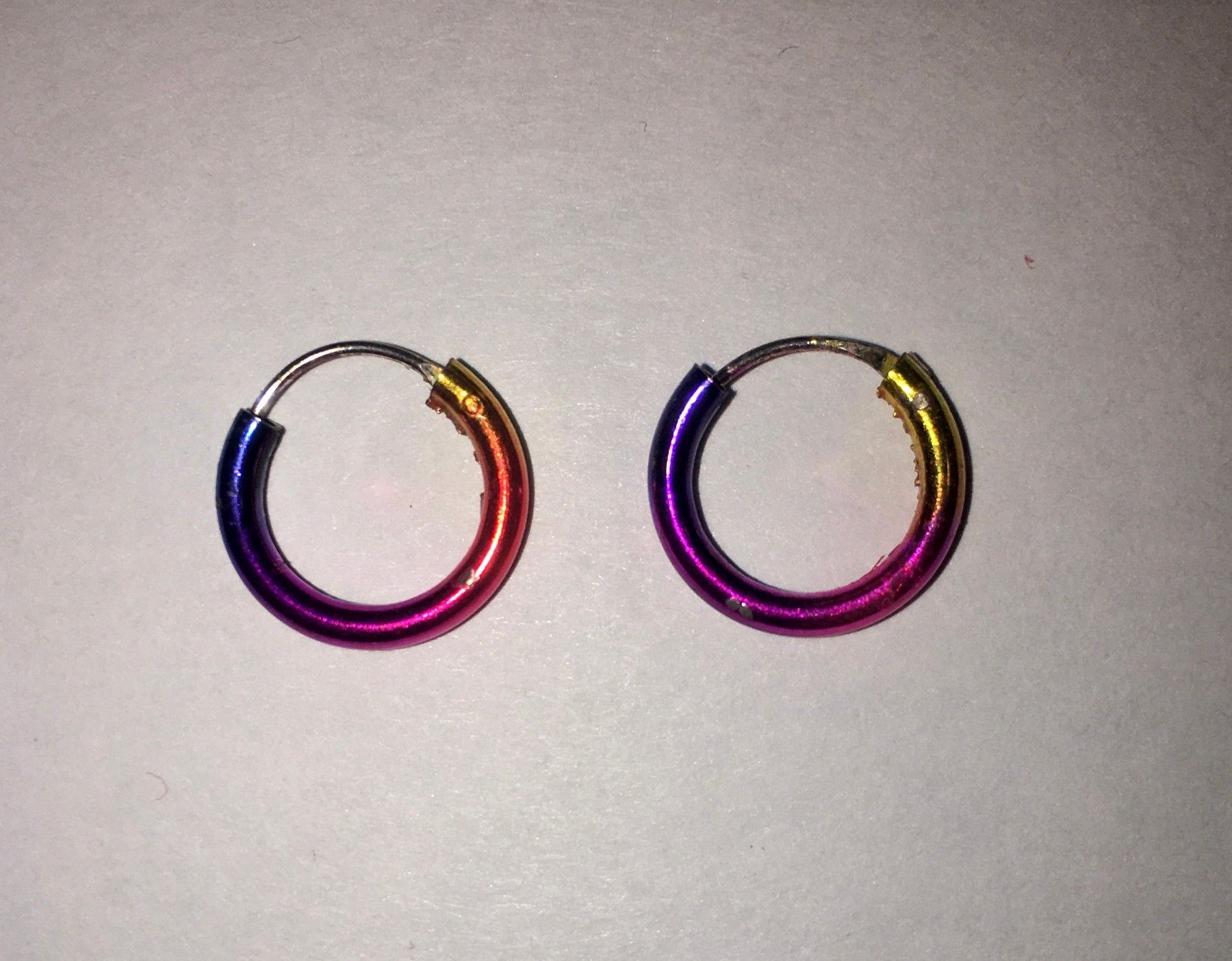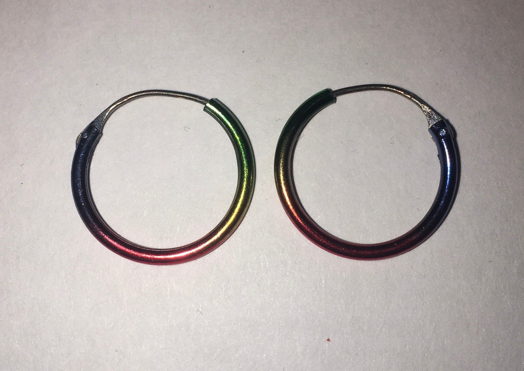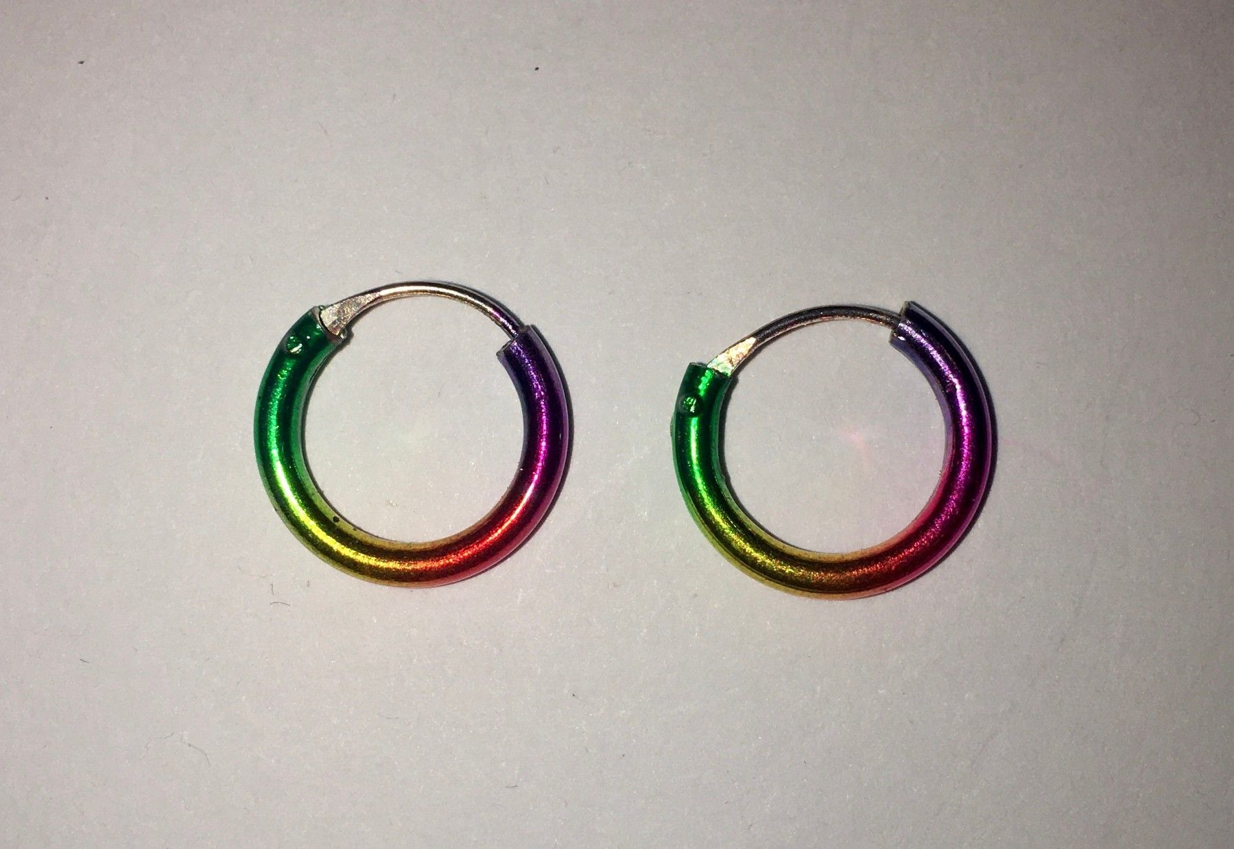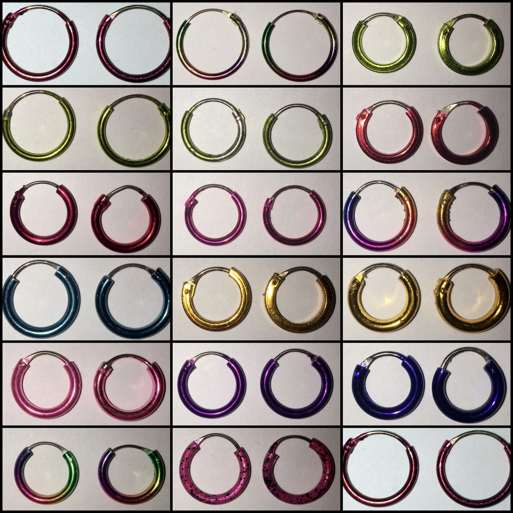 Bunt gefärbte Ohrringe aus ungestempelten 800er Silber von Götz Barner Verschiedene Durchmesser von 9 bis 16 mm Verschiedene Farben: Gold, grün, blau, rot, lila, pink,türkis und Regenbogen Handarbeit aus Hamburg St.Pauli