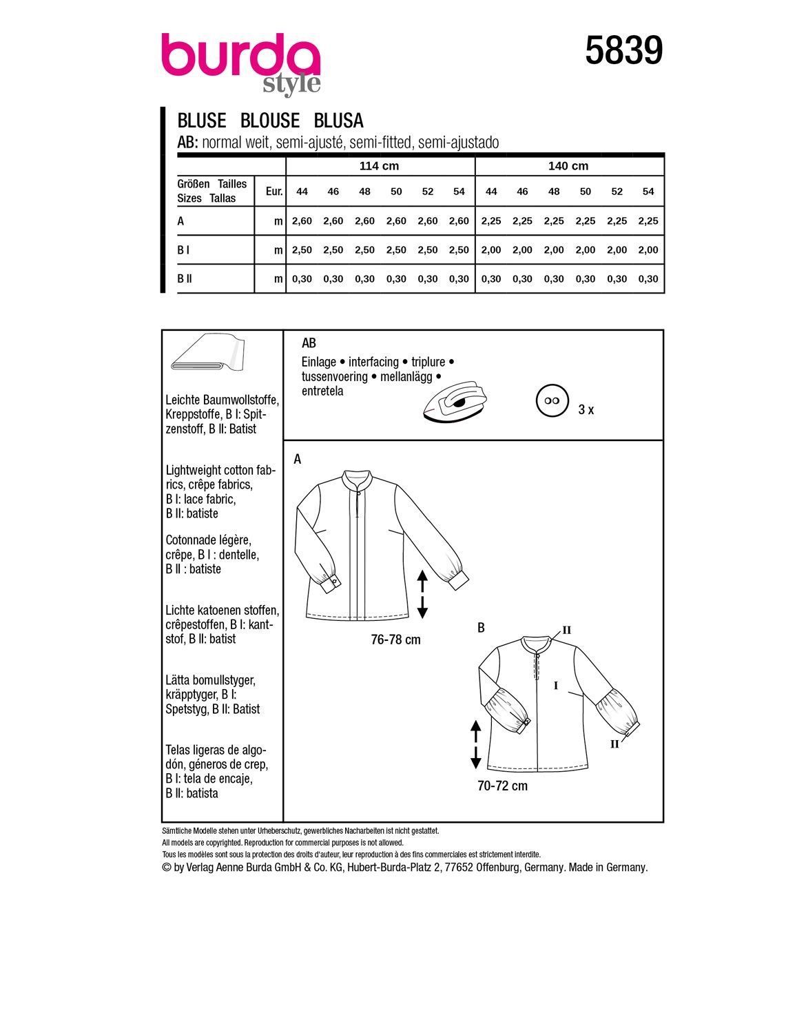 burda Papier-Schnitt Damen-Bluse mit Stehkragen #5839 Gr.44-54