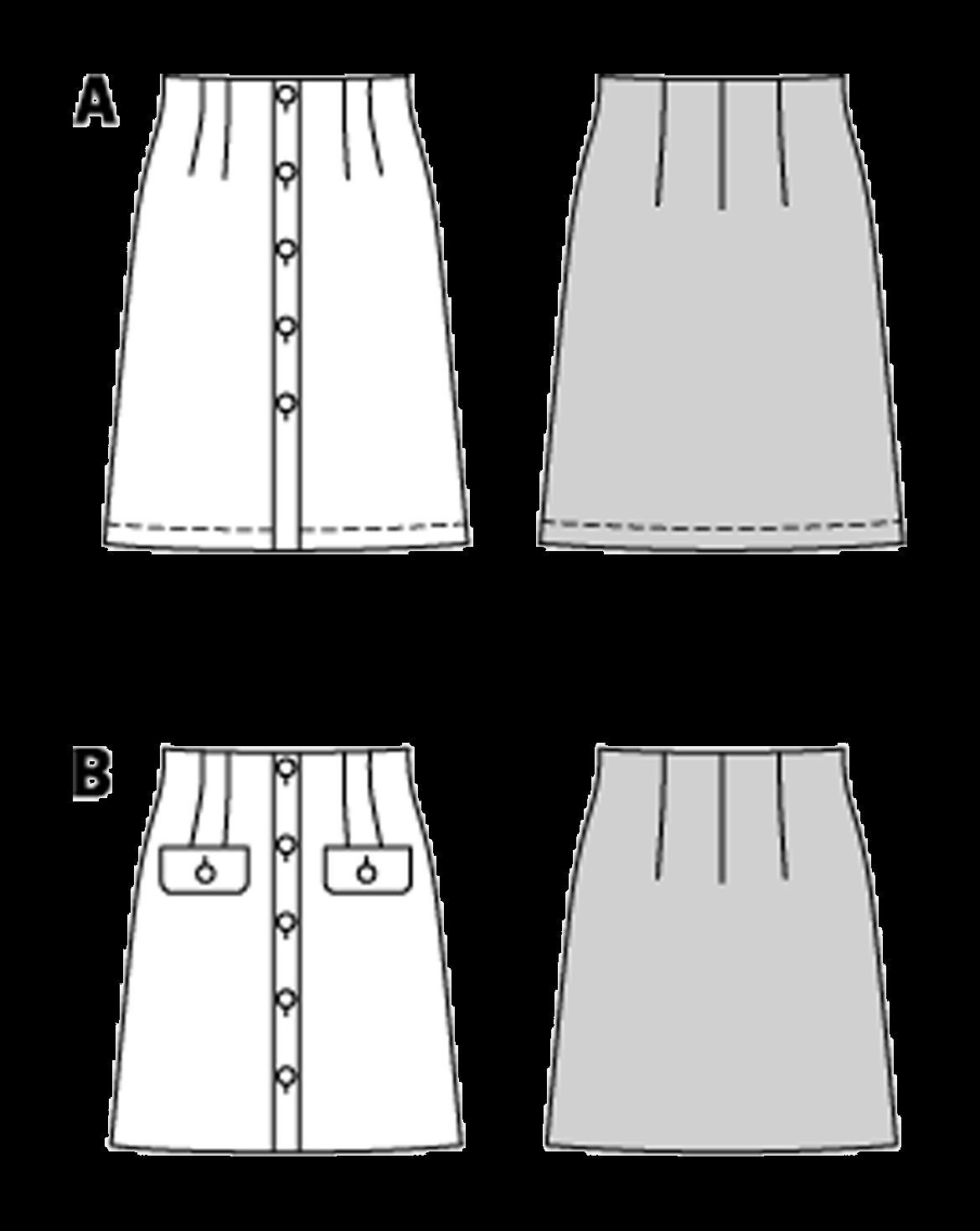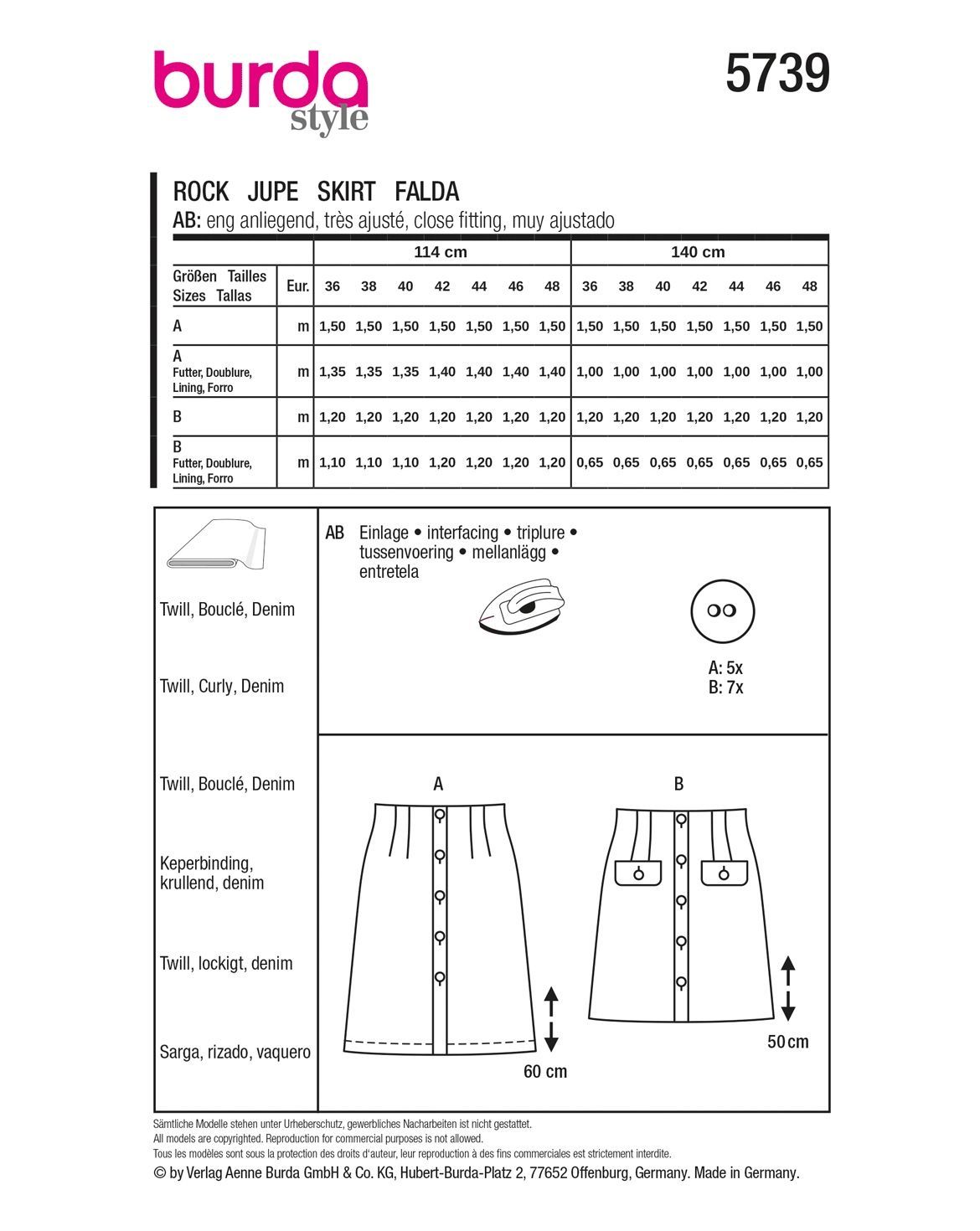 burda Papierschnittmuster Bleistiftrock m. Knopfleiste & Minirock aus Boucle #5739