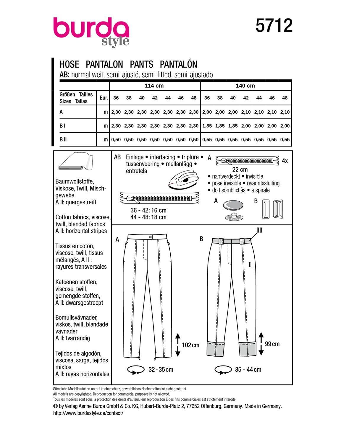 burda Schnittmuster Damen elegante Hosen #5712 Gr. 36-48