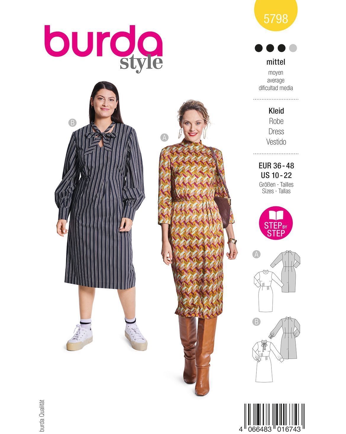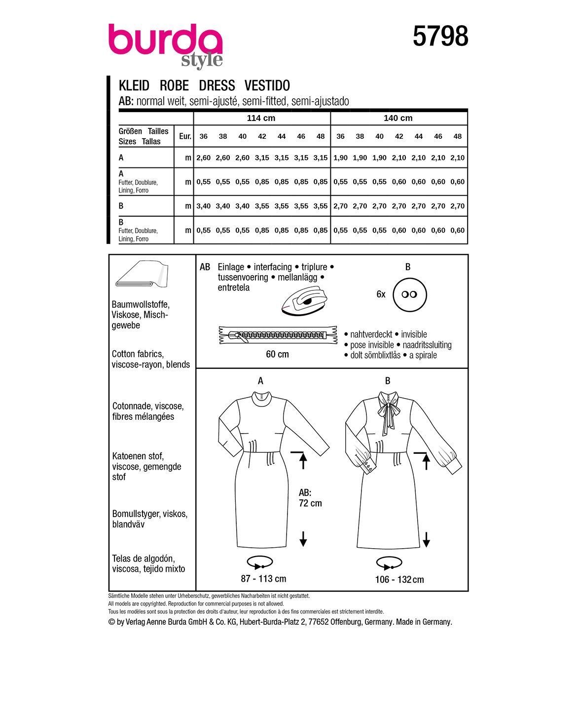 burda Schnittmuster Damen Kleid Vintagelook/Schluppenkleid Midi #5798 Gr. 36-48