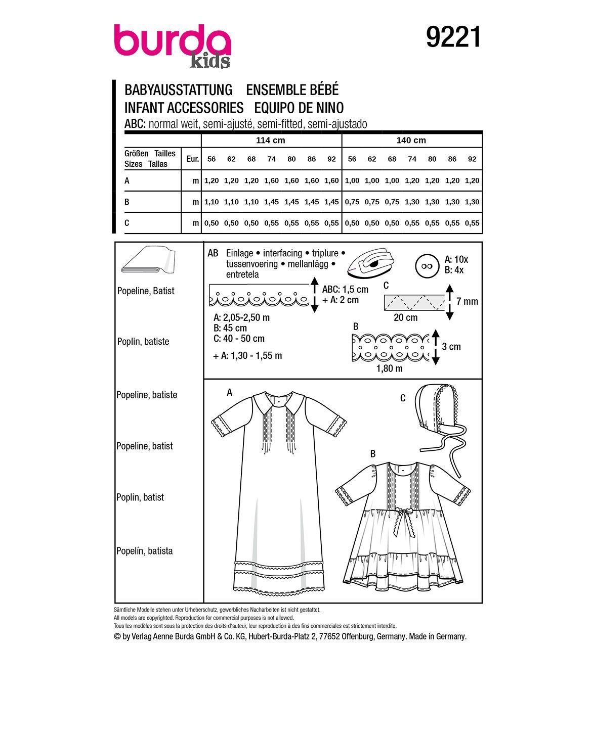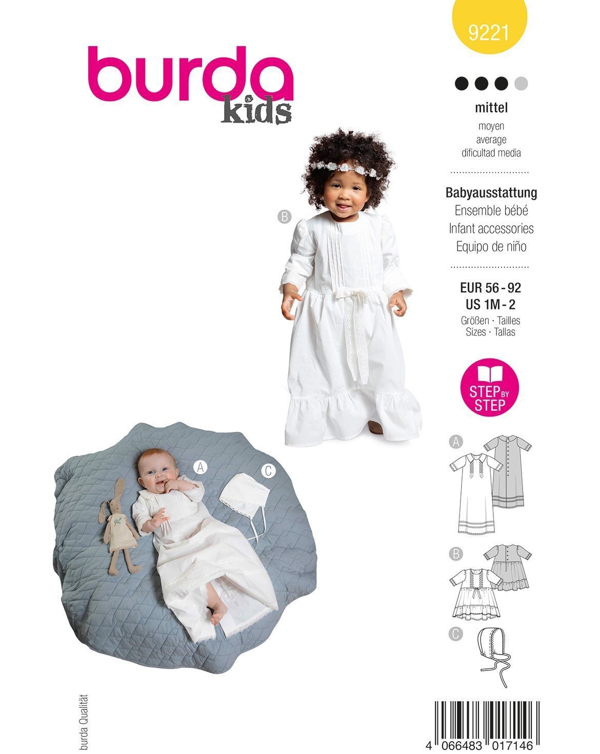 burda Schnittmuster Kinder-Set Baby Taufkleider & Mütze #9221 Gr. 56-92