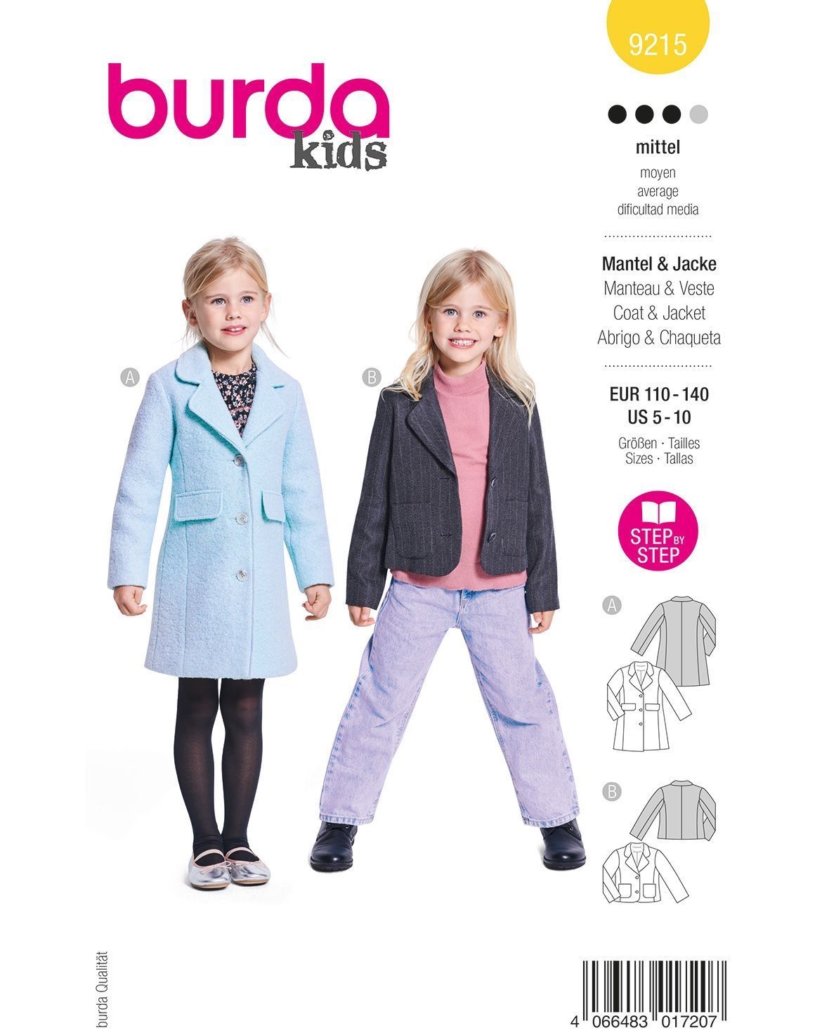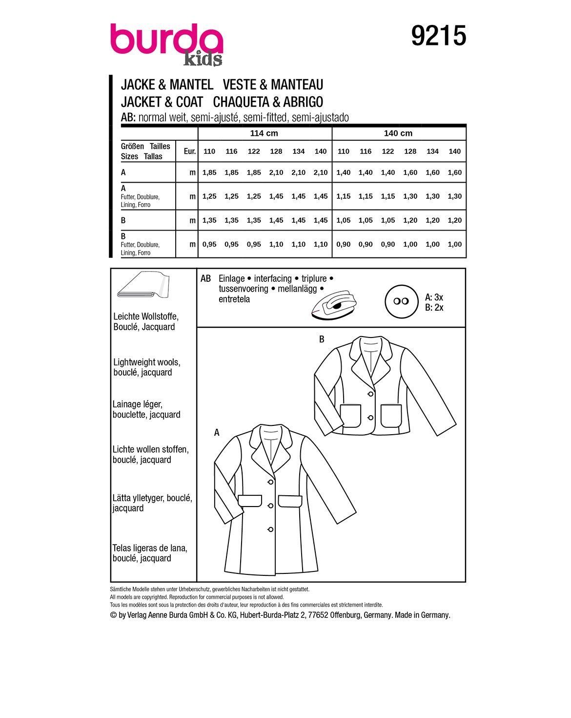 burda Schnittmuster Mädchen Bouclé-Mantel & sportlicher Blazer #9215 Gr. 110-140