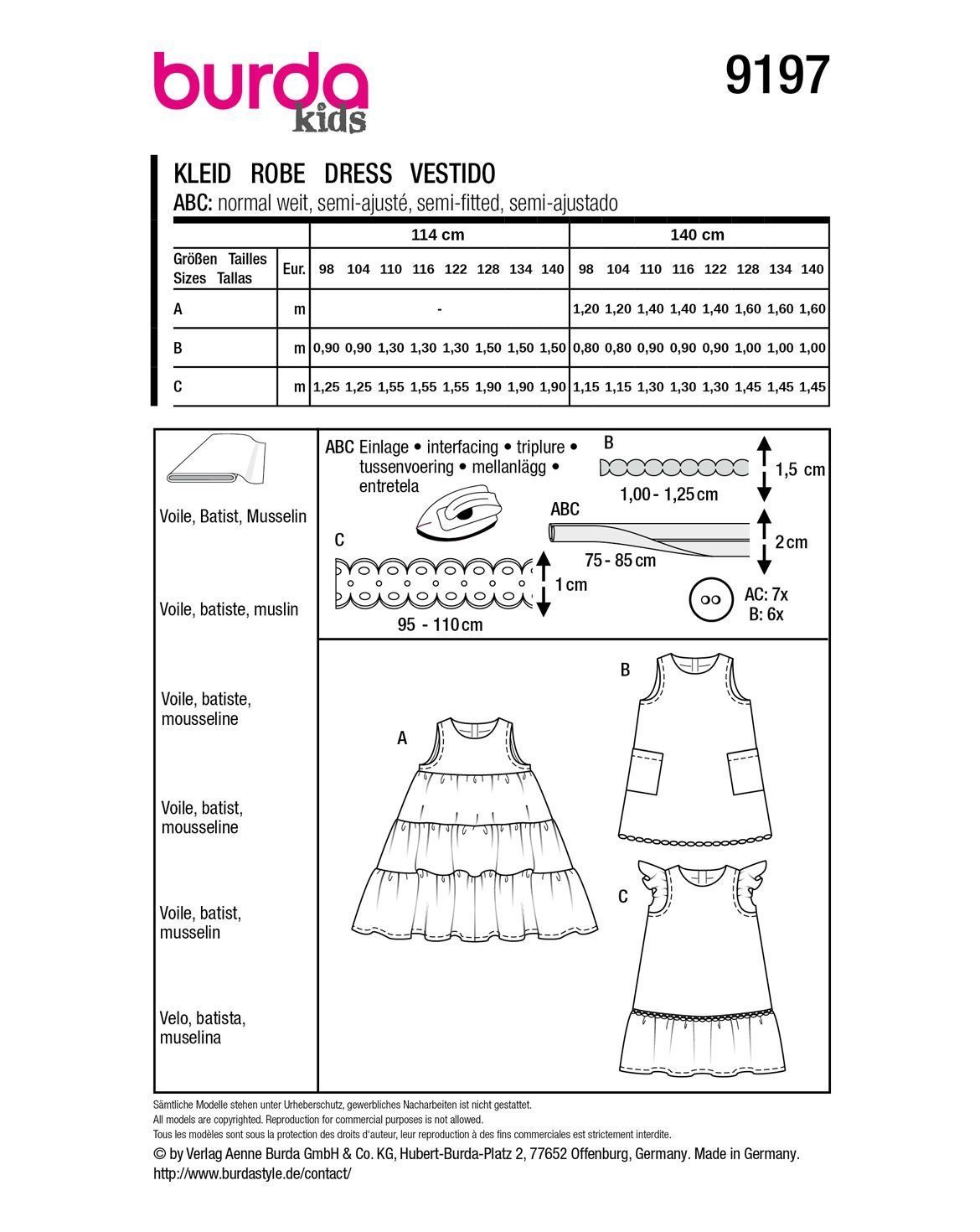 burda Schnittmuster Mädchen Kurzarm Sommerkleider #9197 Gr. 98-140
