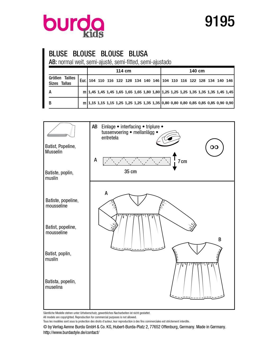 burda Schnittmuster Mädchen Lockere Bluse #9195 Gr. 104-146