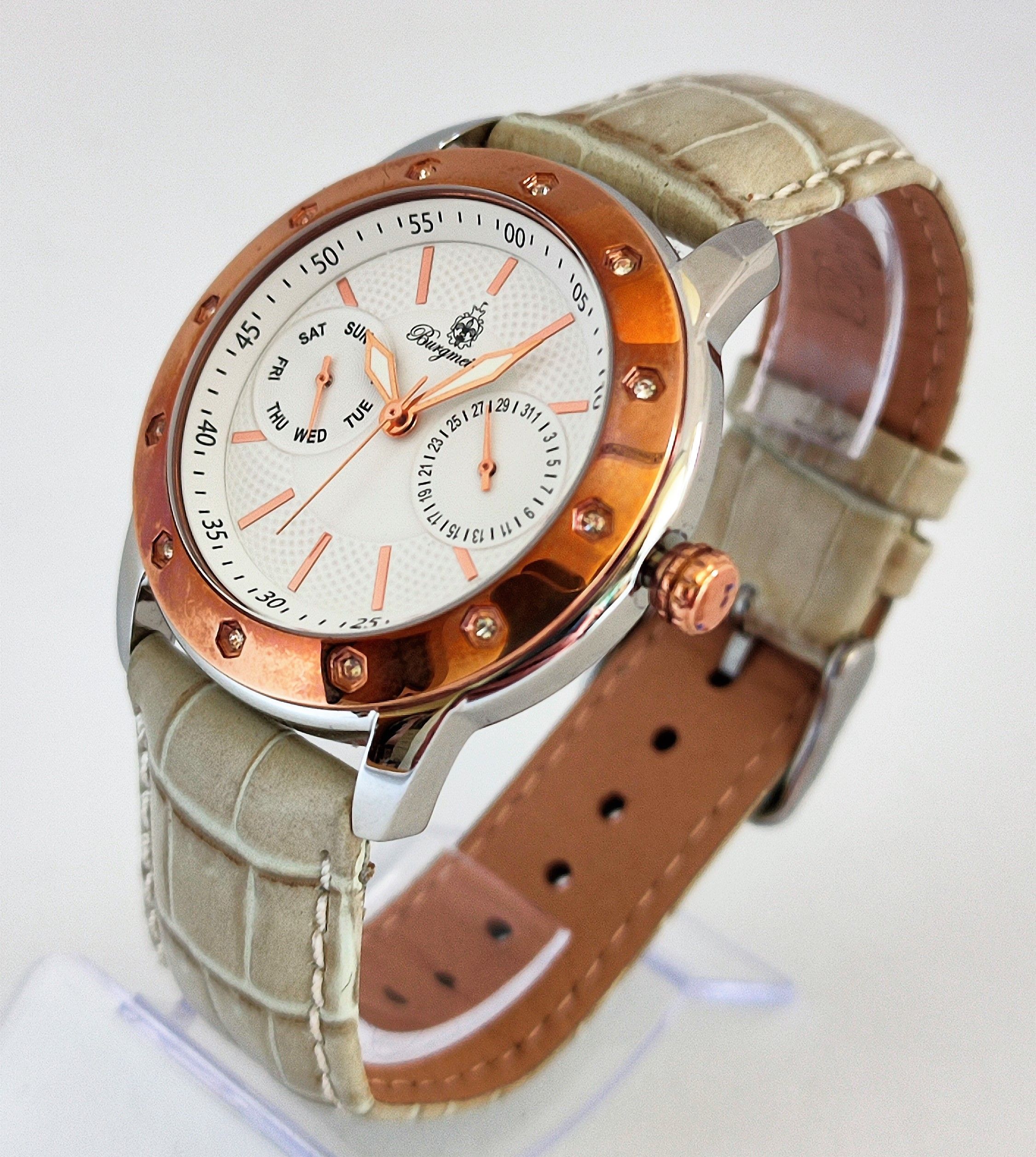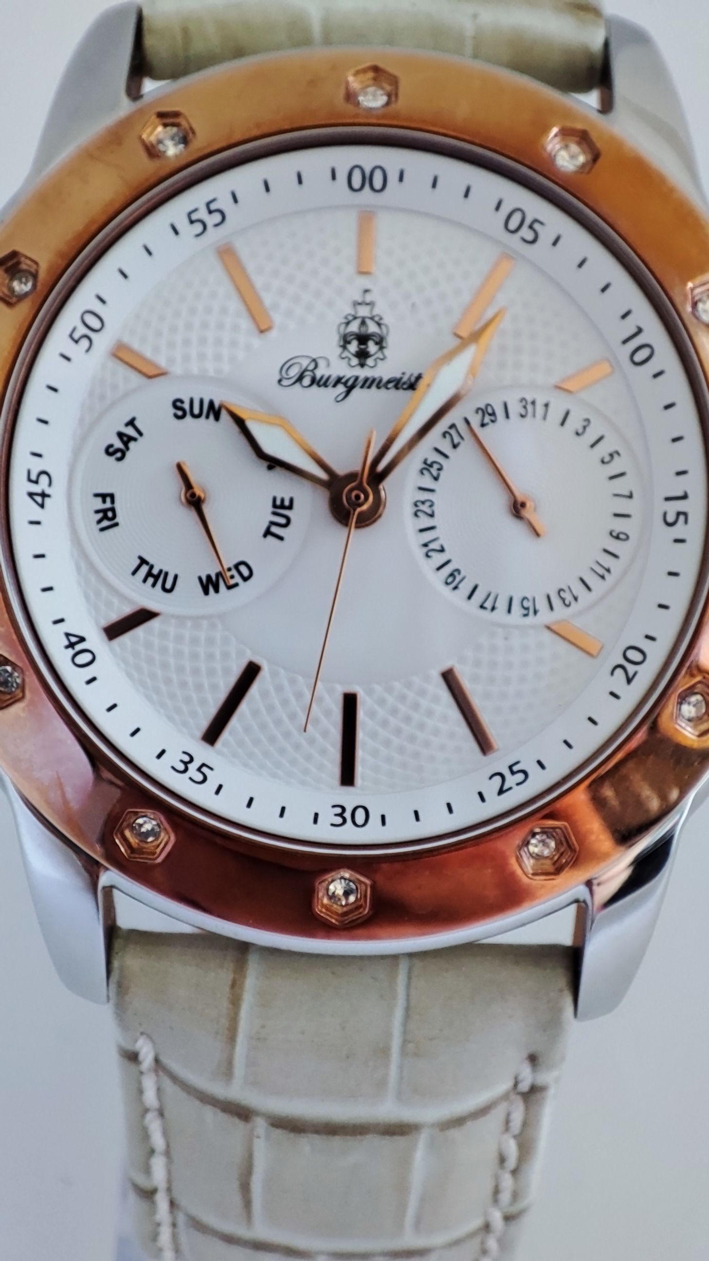 Marke Burgmeister Artikelnummer BM 807-180 Glas Mineral Glas Anzeige Analog Höhe des Gehäuses 9.00 Armbandmaterial Edelstahl Breite des Armbands 20.00 Zifferblattfarbe Weiß Ausstattung Wasserdicht Uhrwerk Quarz 10 ATM Die Batterie muss gewechselt werden Service: Sie erhalten nach erfolgreich abgesch