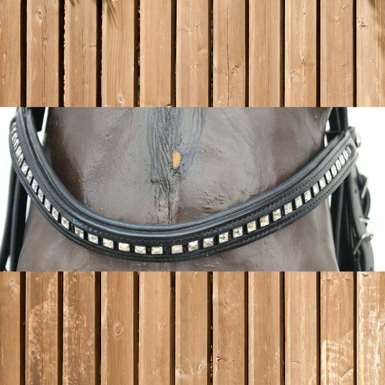 Busse Kandare Strass · Aus erstklassigem Qualitätsleder in optimaler Verarbeitung · schwedisches Reithalfter · mit extra Kinnpolster · Weich gepolsterter Nasen- und Stirnriemen · Stirnriemen mit eckigen Strasssteinen · eckige stabile Edelstahlbeschläge · Inklusive ein Paar Lederzügel mit Gummiprofil