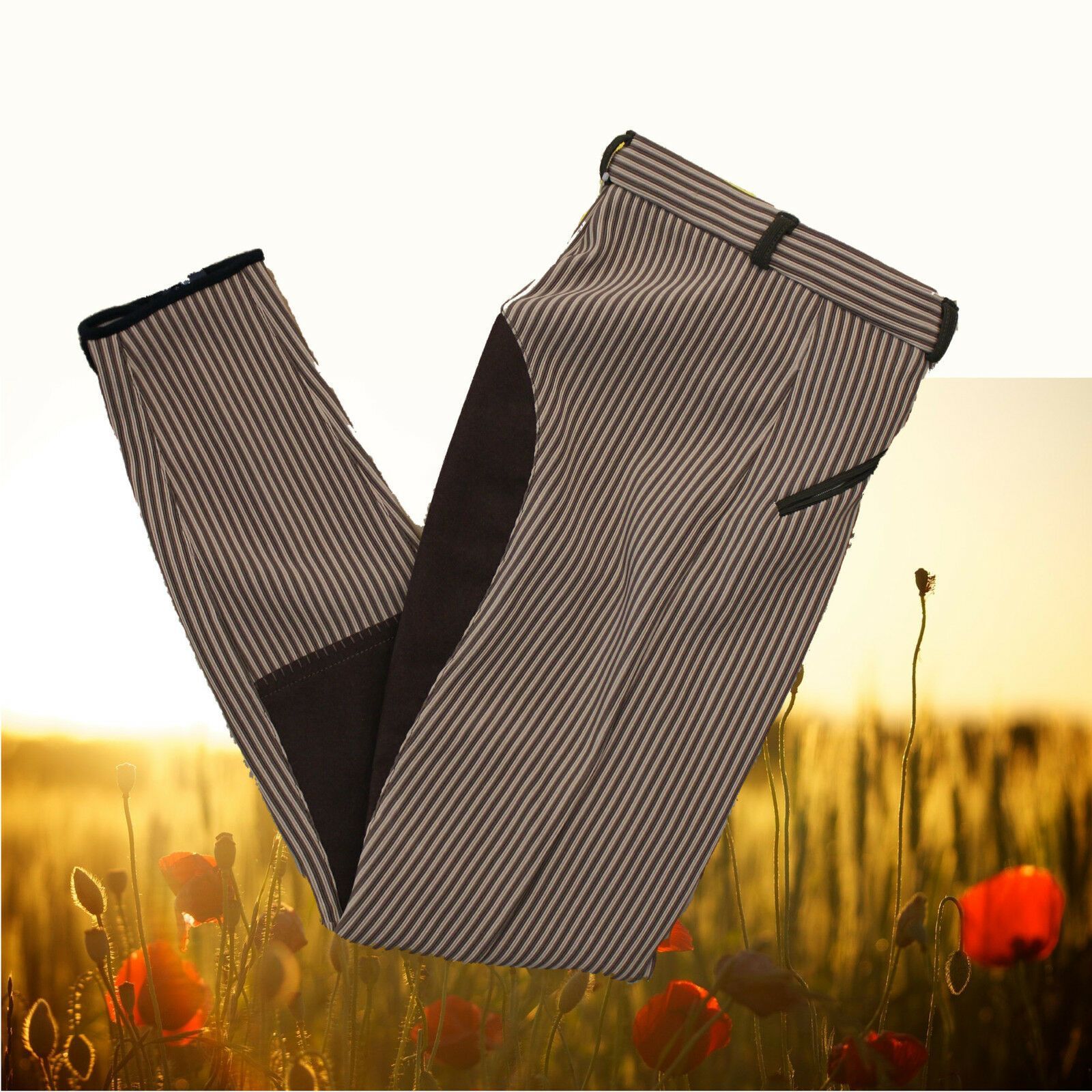 Busse Reithose Classic Touch Ulli in braun-beige Streifen · Moderne Kinderreithose · Vollbesatz · Strapazierfähig · Besonders pflegeleicht · Aus Polyester- Spandex-Ripp · Klassischer Schnitt · Mit Elastikbündchen · Schräge Reißverschlusstasche
