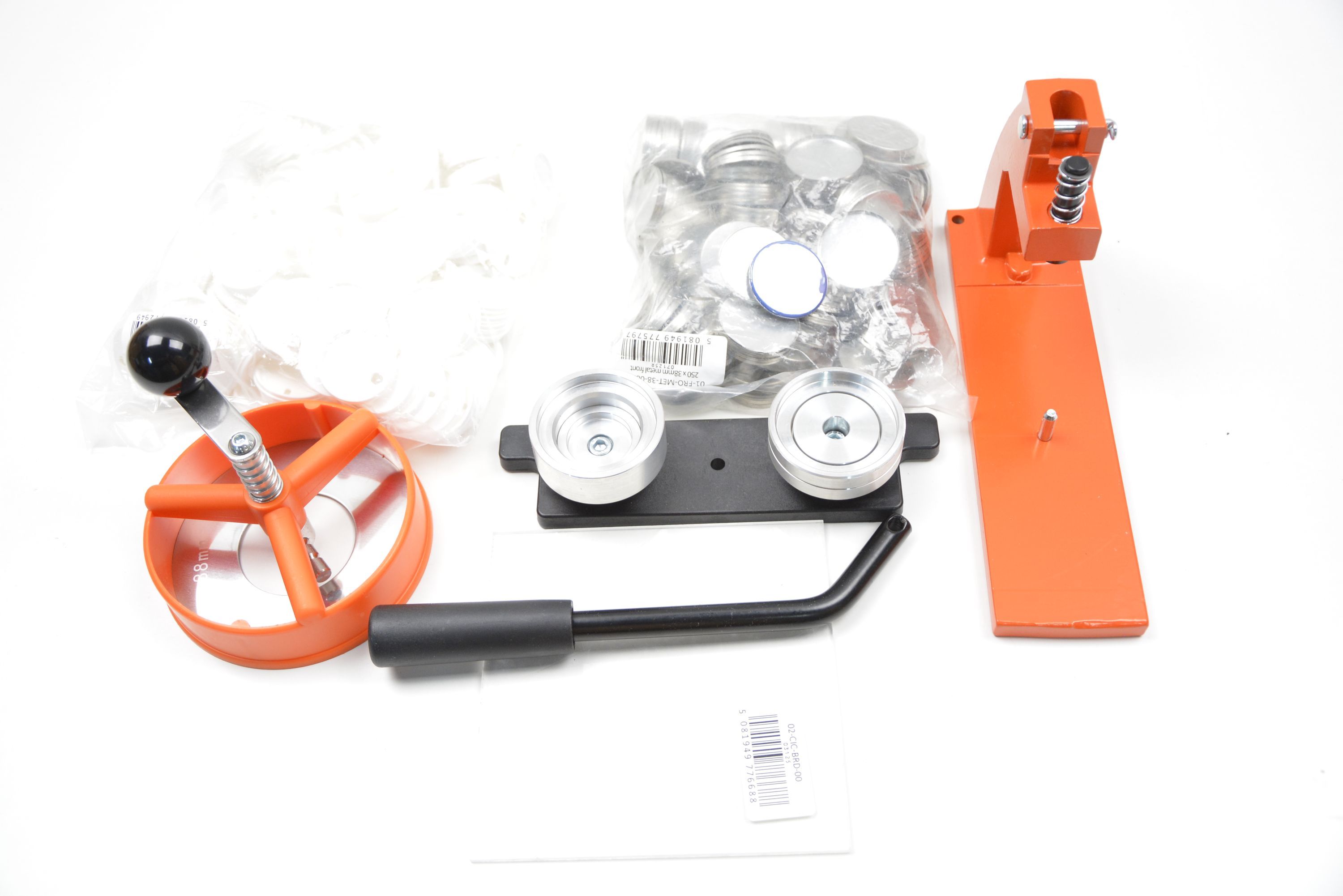 Buttonmaschine 38mm Set mit Kreisschneider und 250 Buttons Metall orange