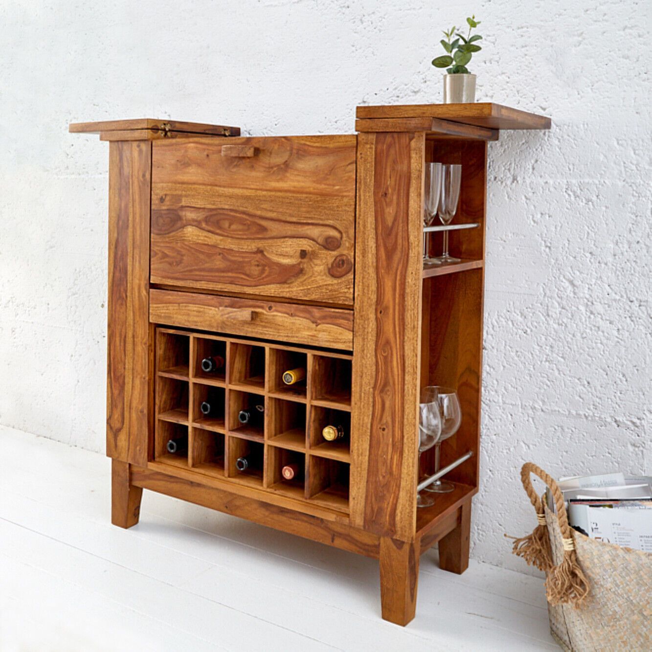 cagü: Exklusive Design Bar Barschrank (SALEM] Sheesham massiv Holz 85cm x 100cm