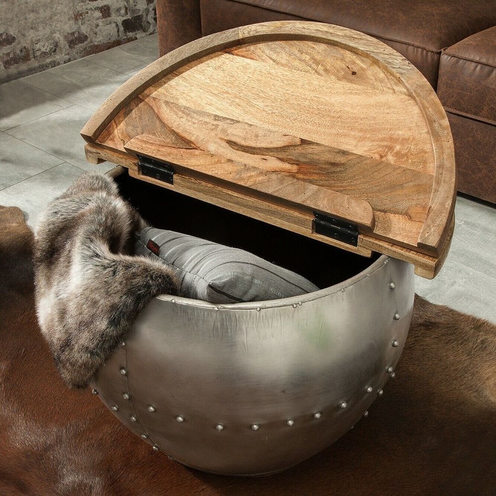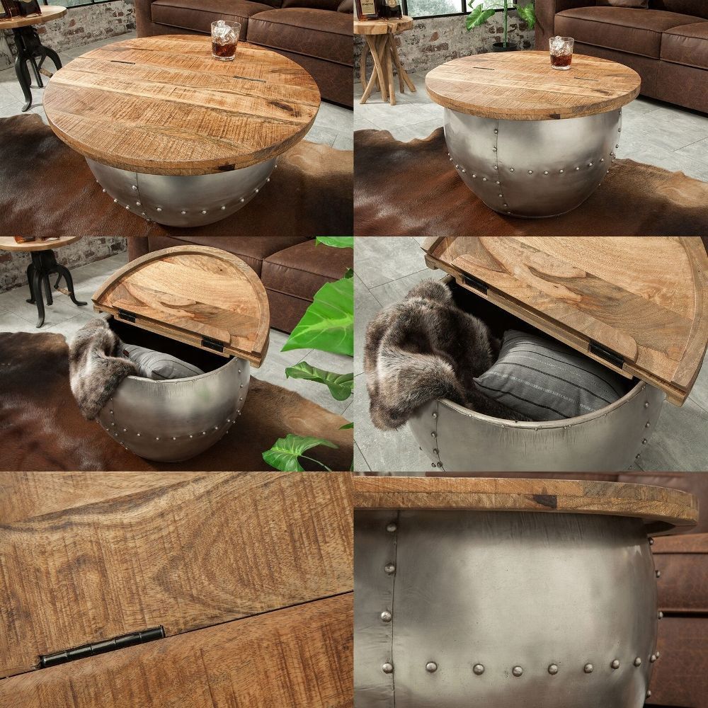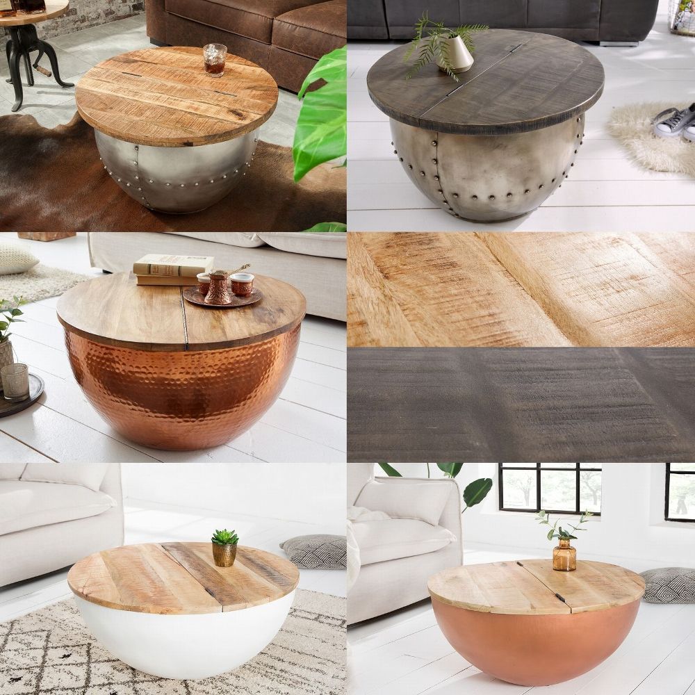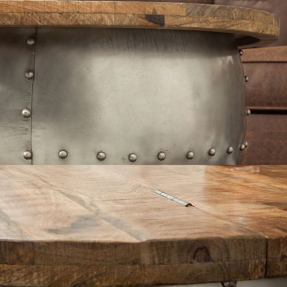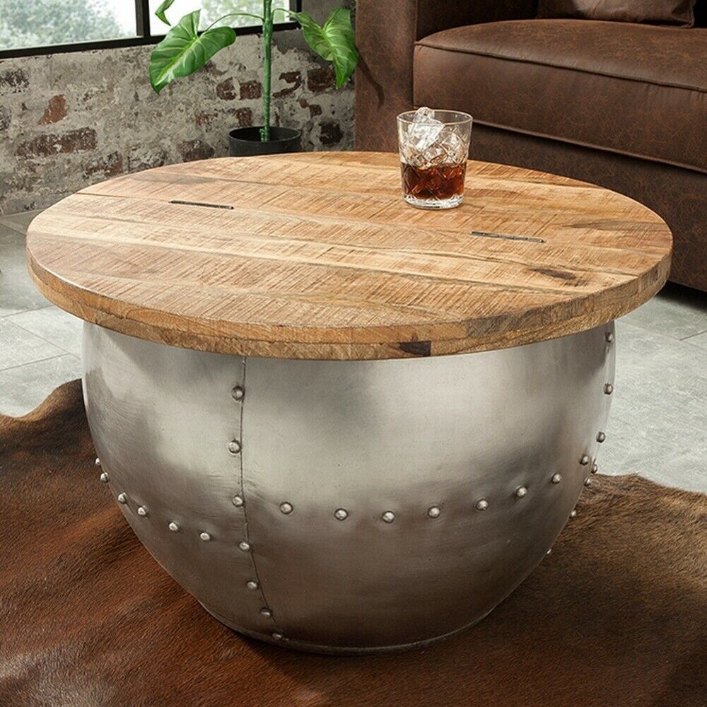cagü: Industrie-Design Couchtisch (PULIM] Natur Mangoholz Metall Nieten 68cm Ø