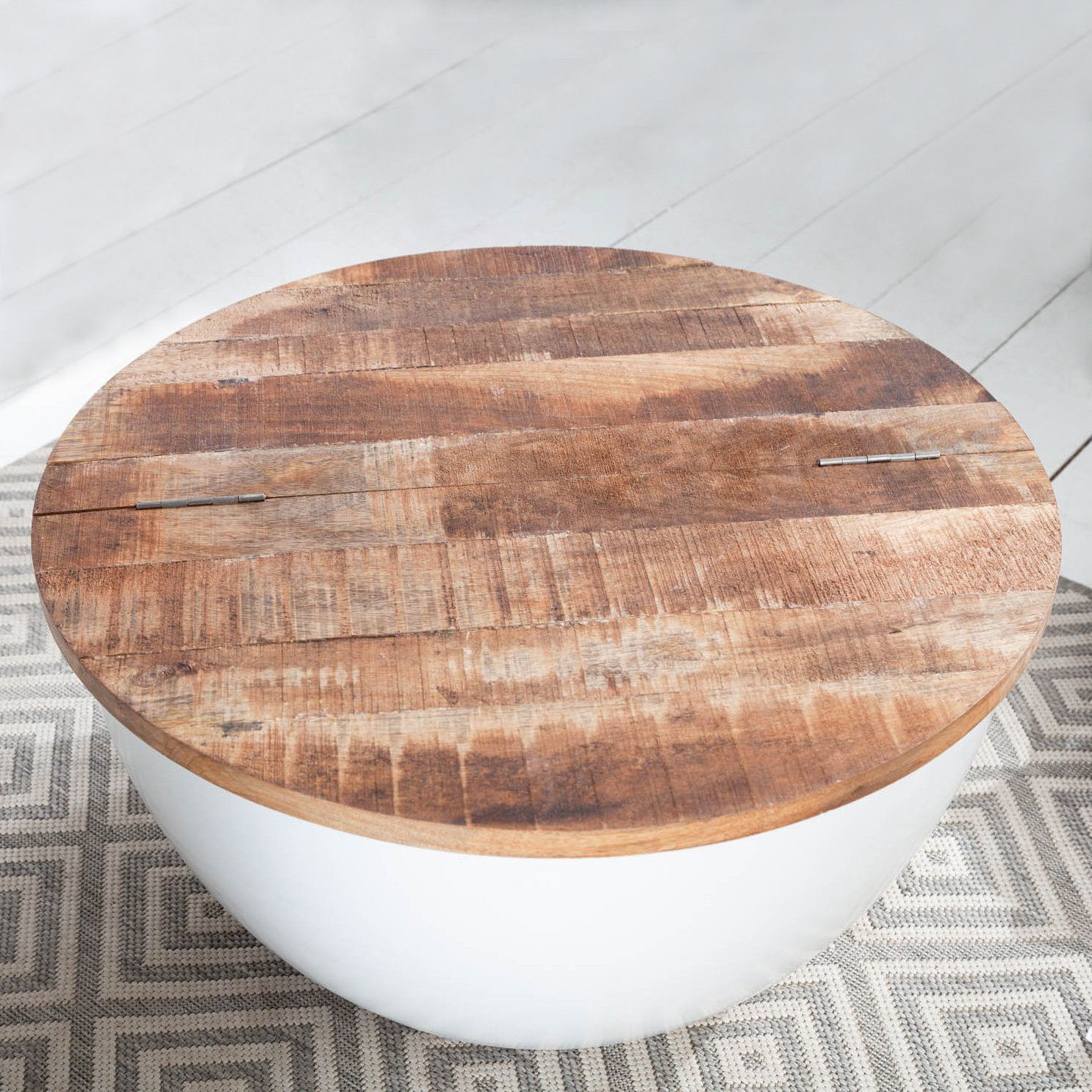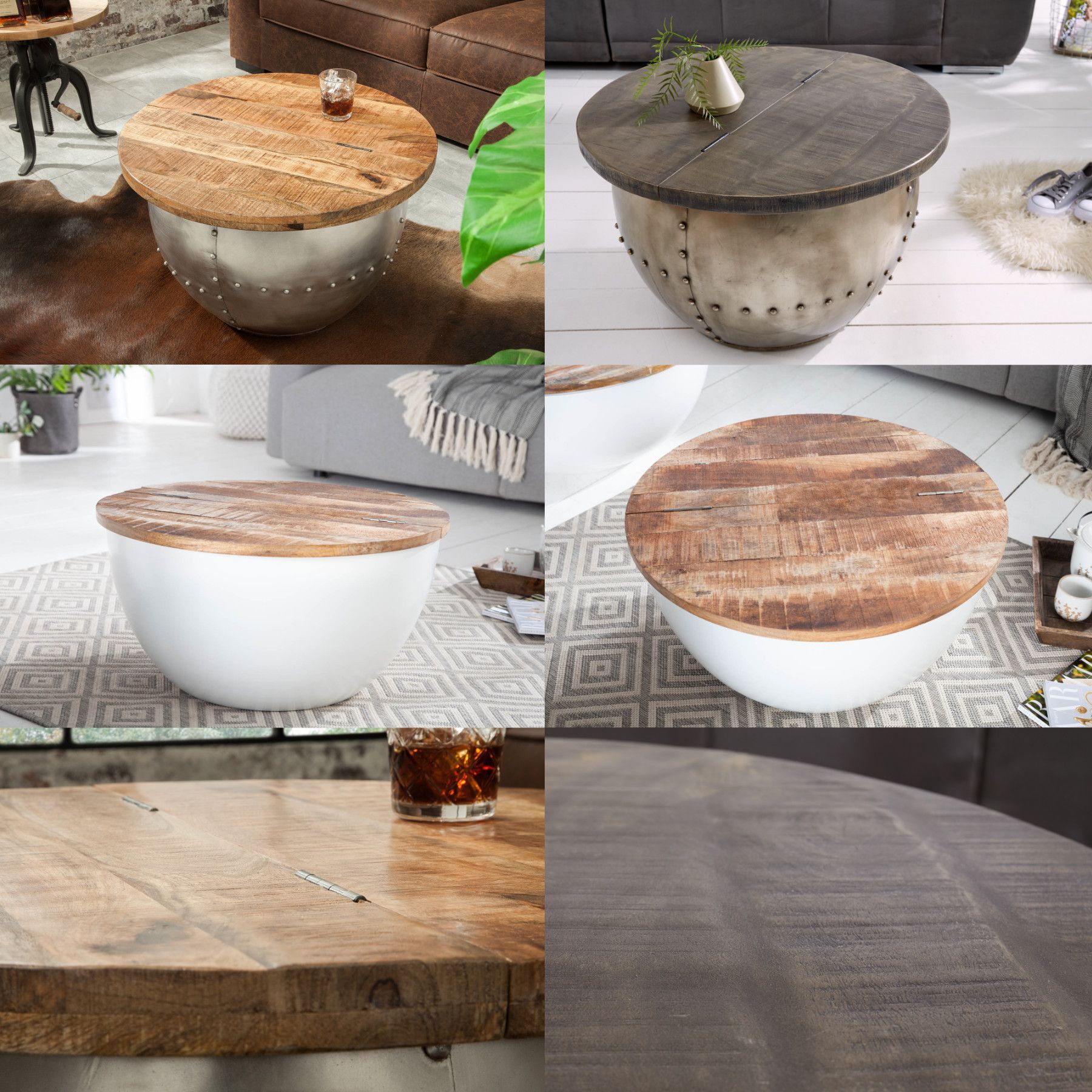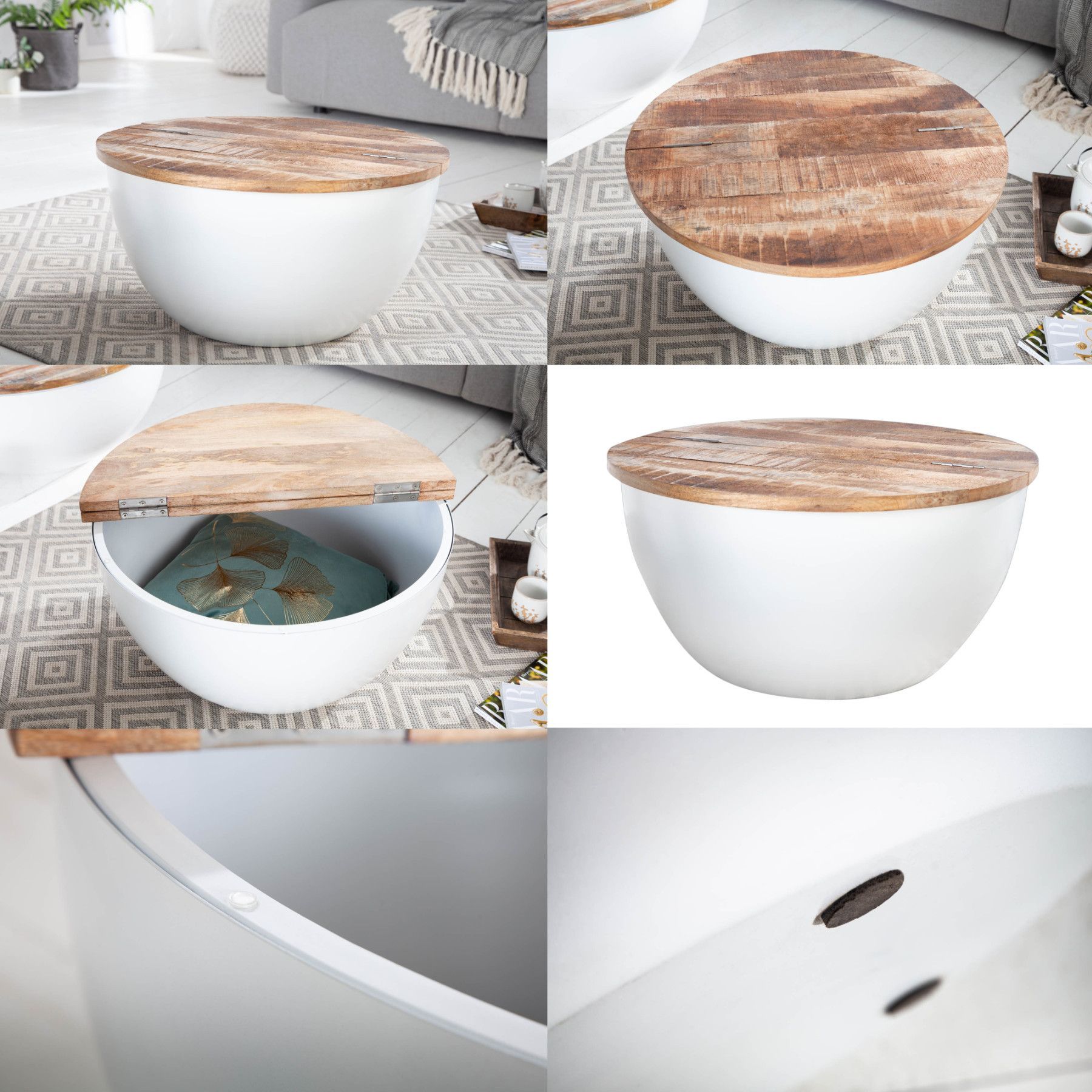 cagü: Industrie-Design Couchtisch (PULIM] Natur Mangoholz Metall Weiß 70cm Ø