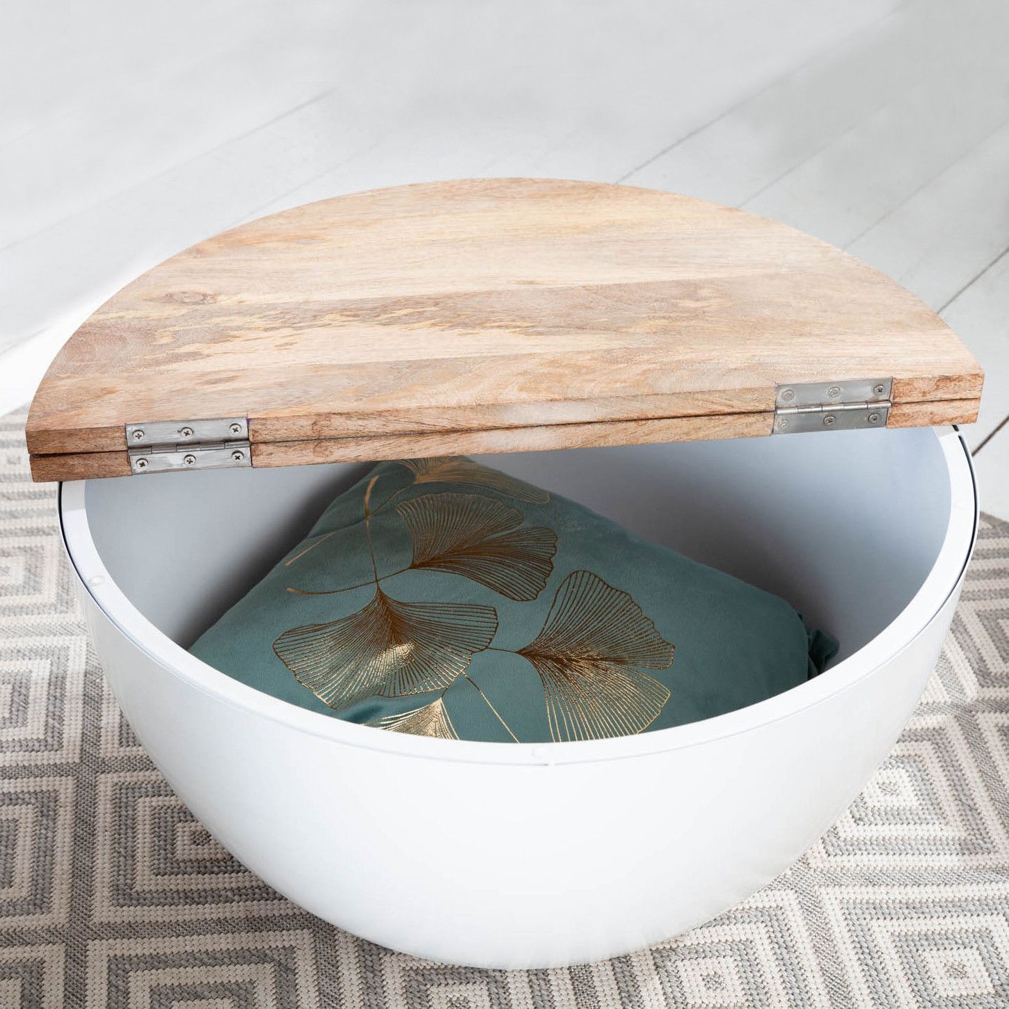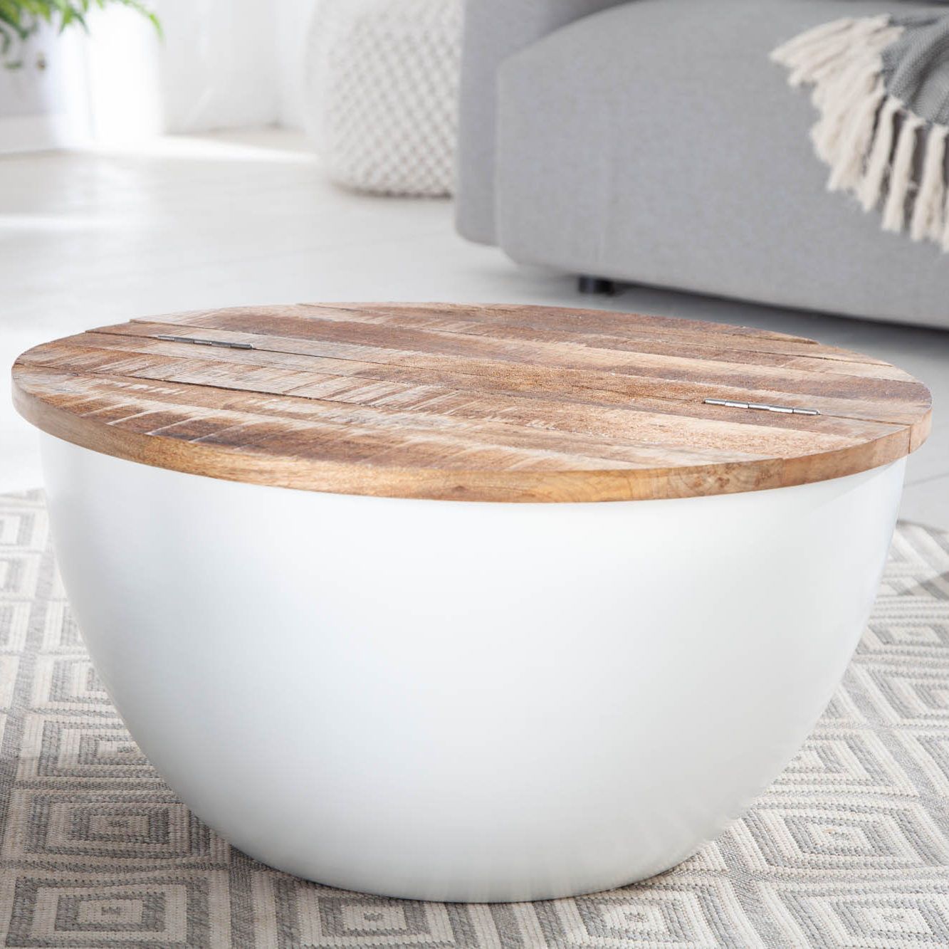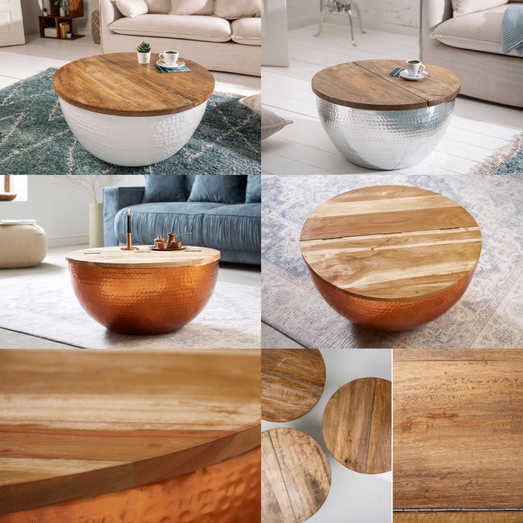 cagü: Industrie-Design Couchtisch (PULIM] Natur Mangoholz Metall Weiß 70cm Ø