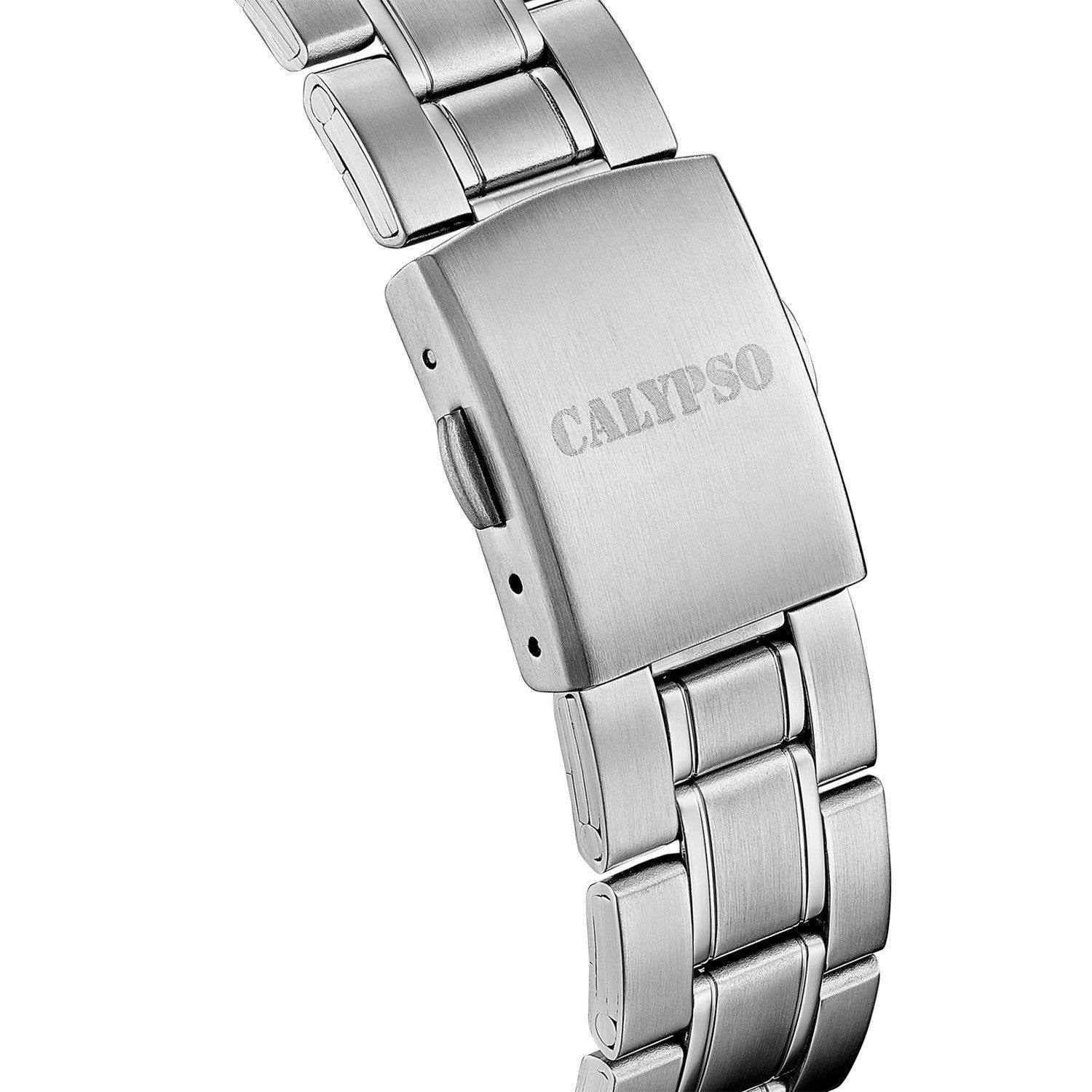 trendige Armbanduhr für Männer, batteriebetriebenes Quarzwerk, Datumsanzeige mit Lupe, hellblaues Sunray-Zifferblatt, lumineszierende Zeiger, gut ablesbare schwarze Zahlen und Indizes, zentraler Sekundenzeiger, poliertes Edelstahl-Gehäuse, matte Bandanstöße, geriffelte Krone, kratzunempfindliches Mineralglas, Armband aus mattiertem Edelstahl mit polierten Streifen, Sicherheitsfaltschließe mit Drücker und Logo, wasserdicht bis 5 bar, Breite (ohne Krone) 40 mm, Höhe 10 mm