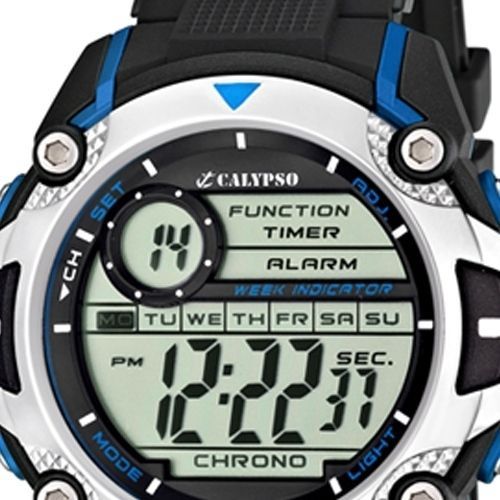 Die Digitaluhr der Marke Calypso verfügt über ein Quarzwerk und hat ein schönes Armband aus Kunststoff PUR in schwarz mit Dornschließe. Die Uhr aus der Calypso Digital Kollektion für Herren hat ein Zifferblatt in der Farbe grau schwarz gepaart mit einer Kunststoffglas-Abdeckung. Die Form der trendig