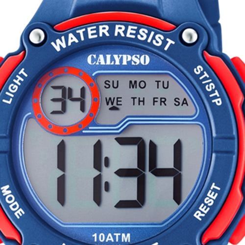 Die Digitaluhr der Marke Calypso verfügt über ein Quarzwerk und hat ein schönes Armband aus Kunststoff PUR in dunkelblau mit Dornschließe. Die Uhr aus der Calypso Digital Kollektion für Kinder hat ein Zifferblatt in der Farbe rot gepaart mit einer Kunststoffglas-Abdeckung. Die Form der trendigen Uhr