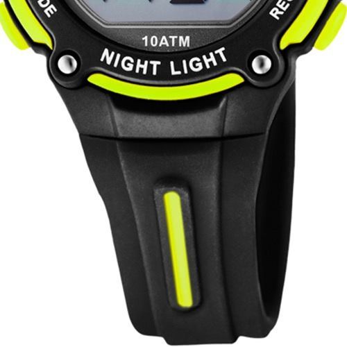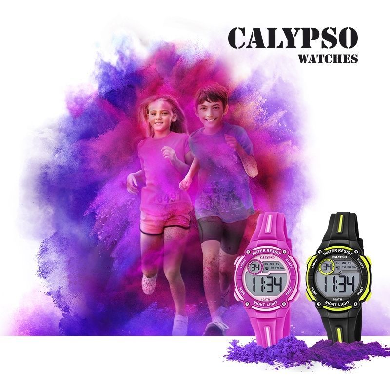 Die Digitaluhr der Marke Calypso verfügt über ein Quarzwerk und hat ein schönes Armband aus Kunststoff PUR in schwarz mit Dornschließe. Die Uhr aus der Calypso Digital Kollektion für Kinder hat ein Zifferblatt in der Farbe gelb gepaart mit einer Kunststoffglas-Abdeckung. Die Form der trendigen Uhr i