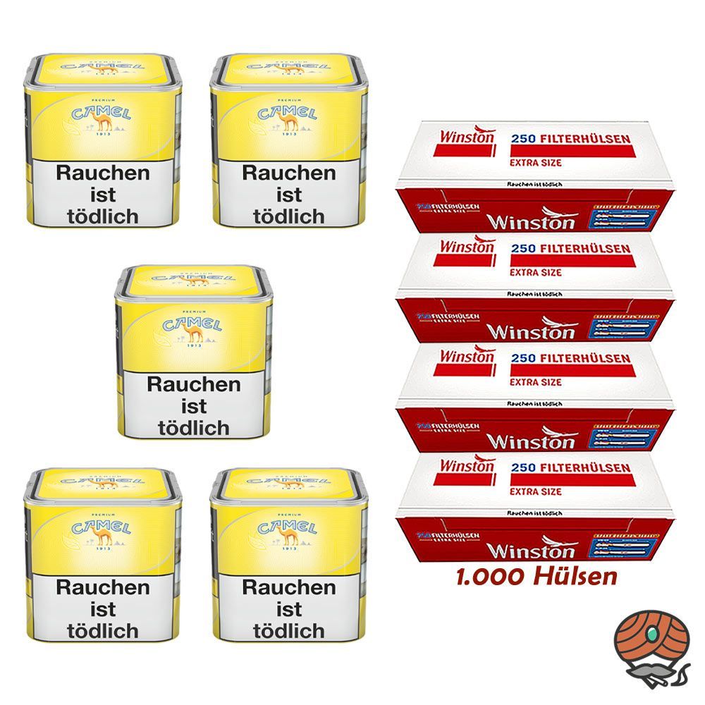 5 x Camel Yellow Gelb Feinschnitttabak Tabak Dose + 1.000 Winston Extra Filterhülsen Tabak: Camel Feinschnitt Tabak eignet sich optimal zum Stopfen mit der Maschine und zum Drehen von Zigaretten per Hand oder mit der Maschine. Der Tabak besteht aus dunklem Feinschnitttabak = American Blend, bestehen