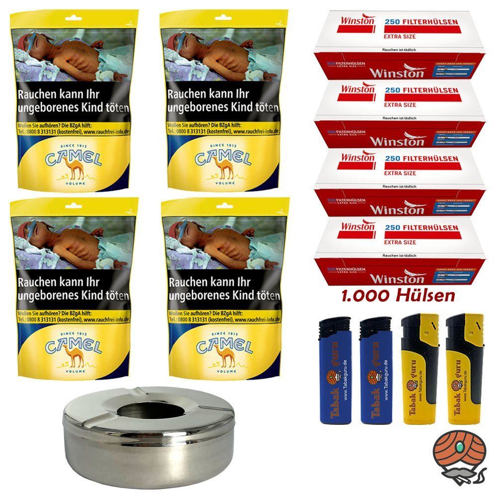 4 x Camel Volumentabak Beutel + 1.000 Winston Extra Filterhülsen + 2 Sturmfeuerzeuge (nicht wählbar) + 2 Feuerzeuge (nicht wählbar) + 1 Edelstahl - Windaschenbecher (nicht wählbar) Tabak: Camel Volumentabak ist ein sehr ergiebiger Stopftabak zum Stopfen von Zigaretten mit der Maschine. Bei der Tabak