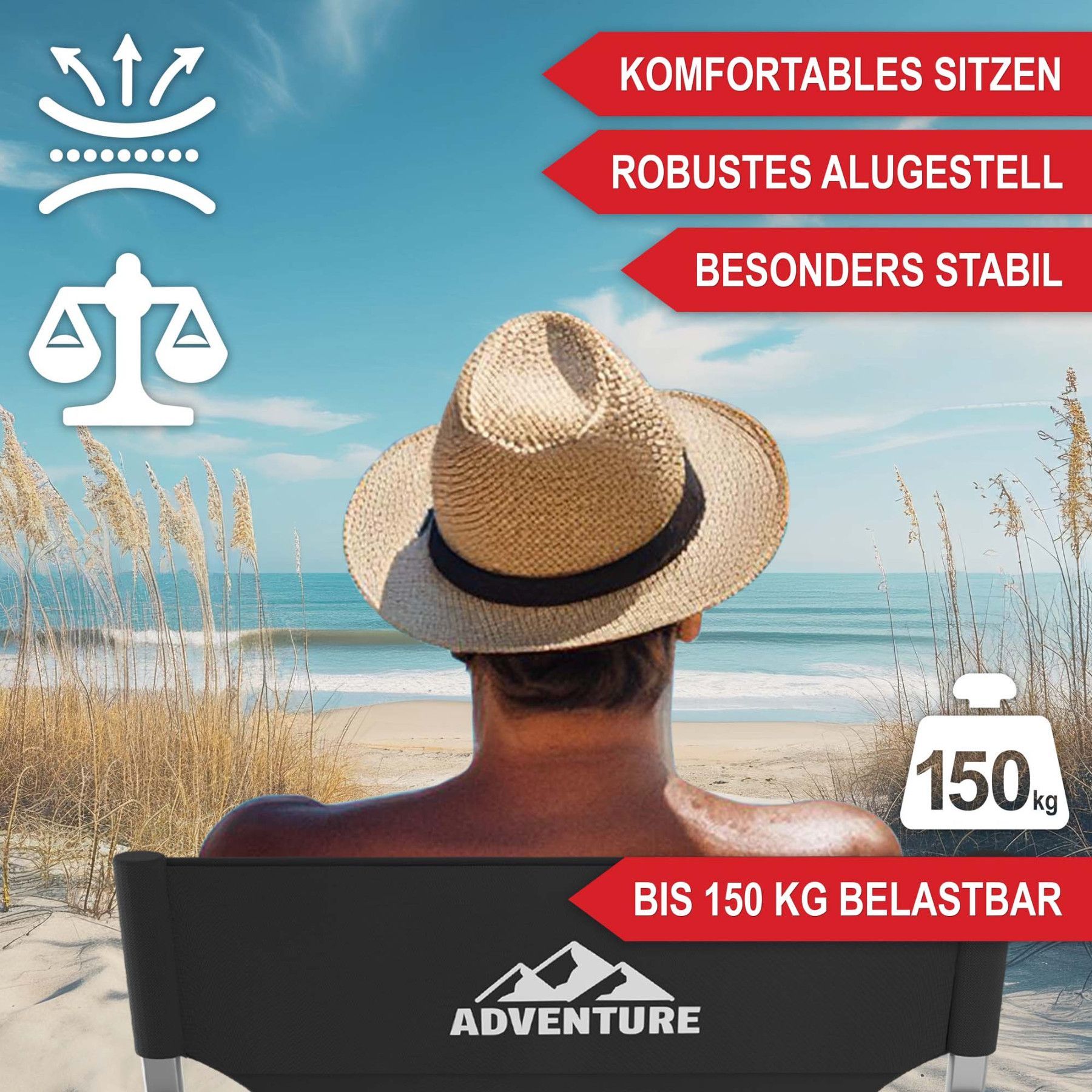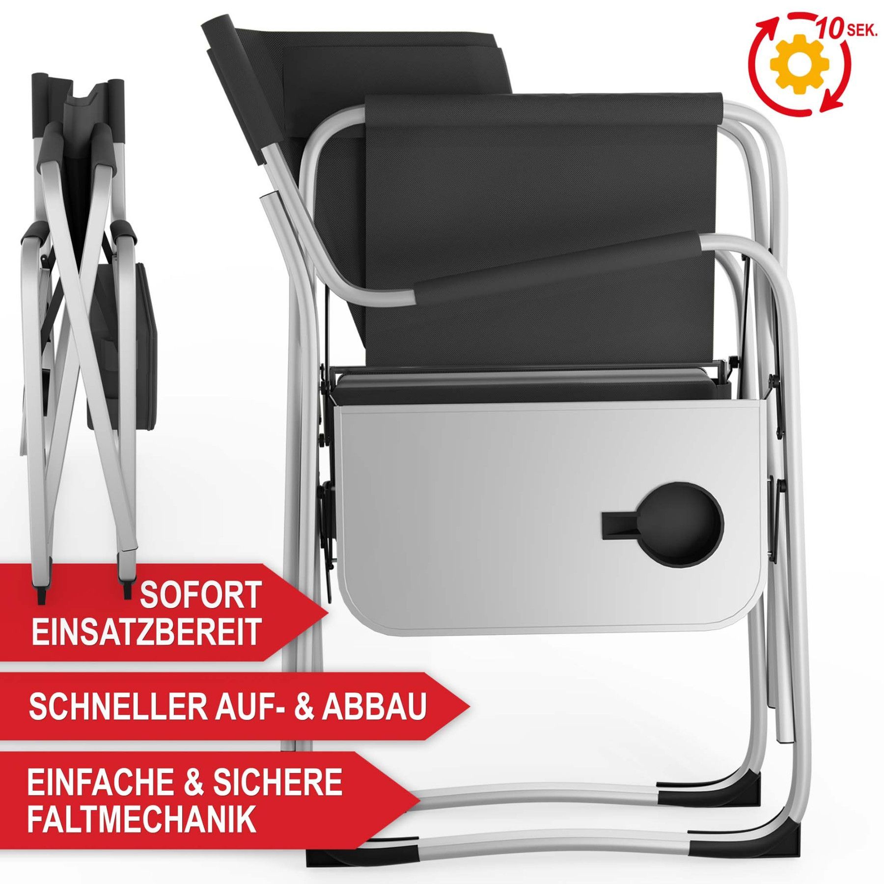 16-Liter-Kühltasche+Klapptisch mit Getränkehalter - Campingstuhl mit Kühltasche »Schwarz« Der Campingstuhl in Schwarz bietet die perfekte Kombination aus Komfort und Funktionalität für jede Outdoor-Aktivität. Mit einer extra breiten Sitzfläche, gepolsterten Armlehnen, einem praktischen Klapptisch mi