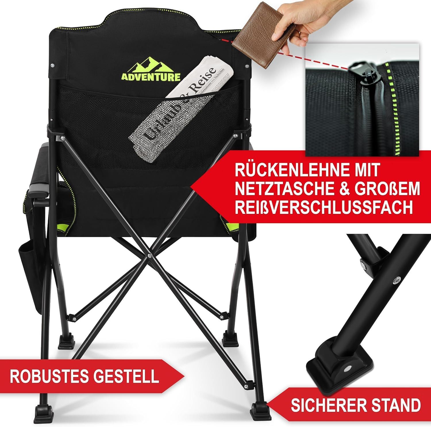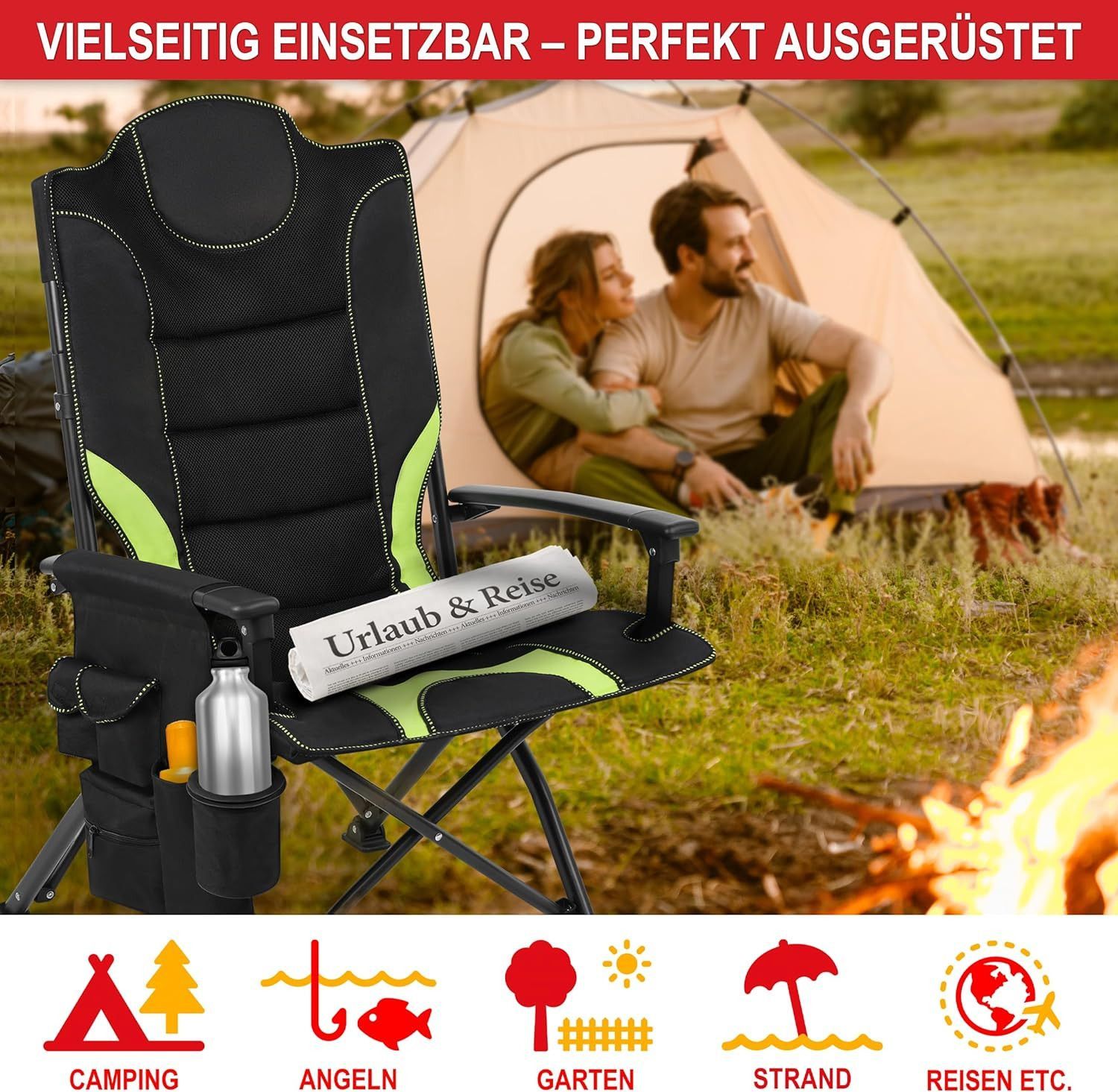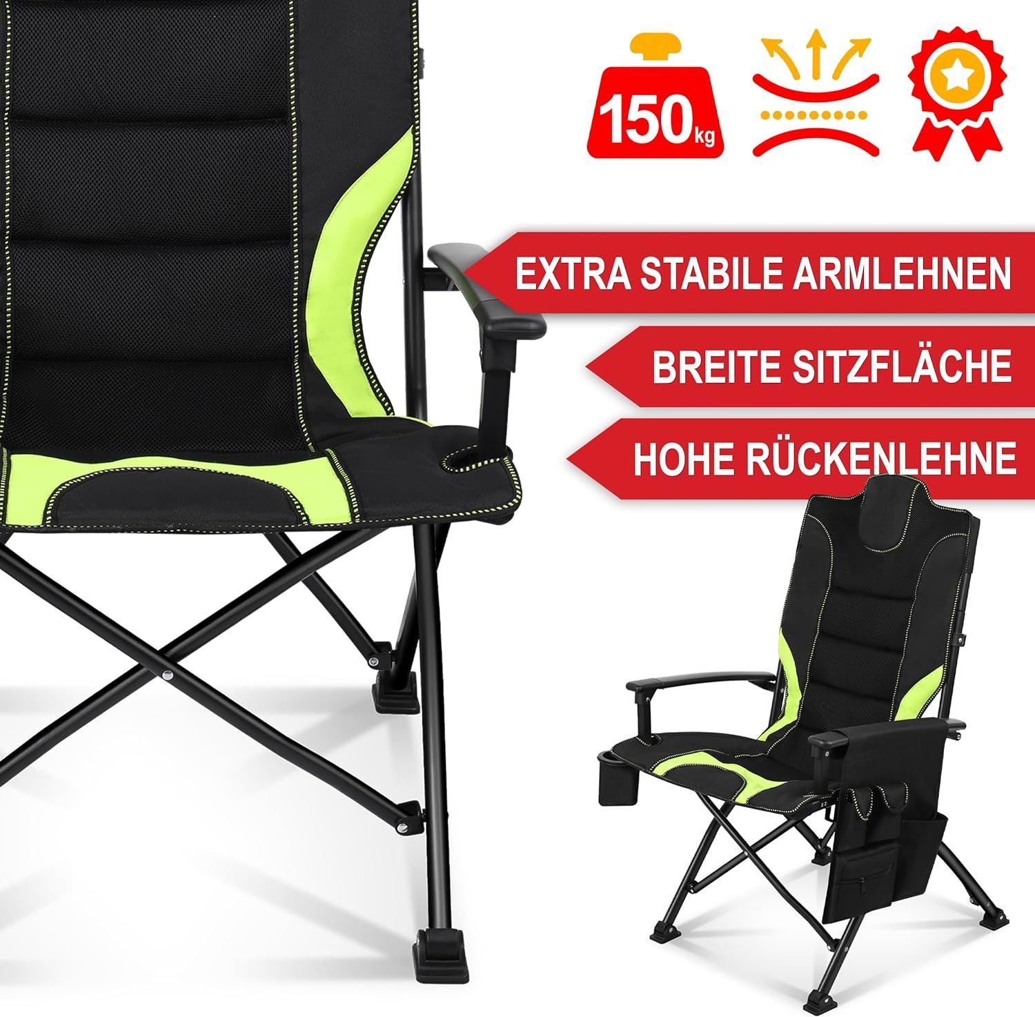 Campingstuhl faltbar Klappstuhl Camping Stuhl Hochlehner gepolstert Schwarz Grün