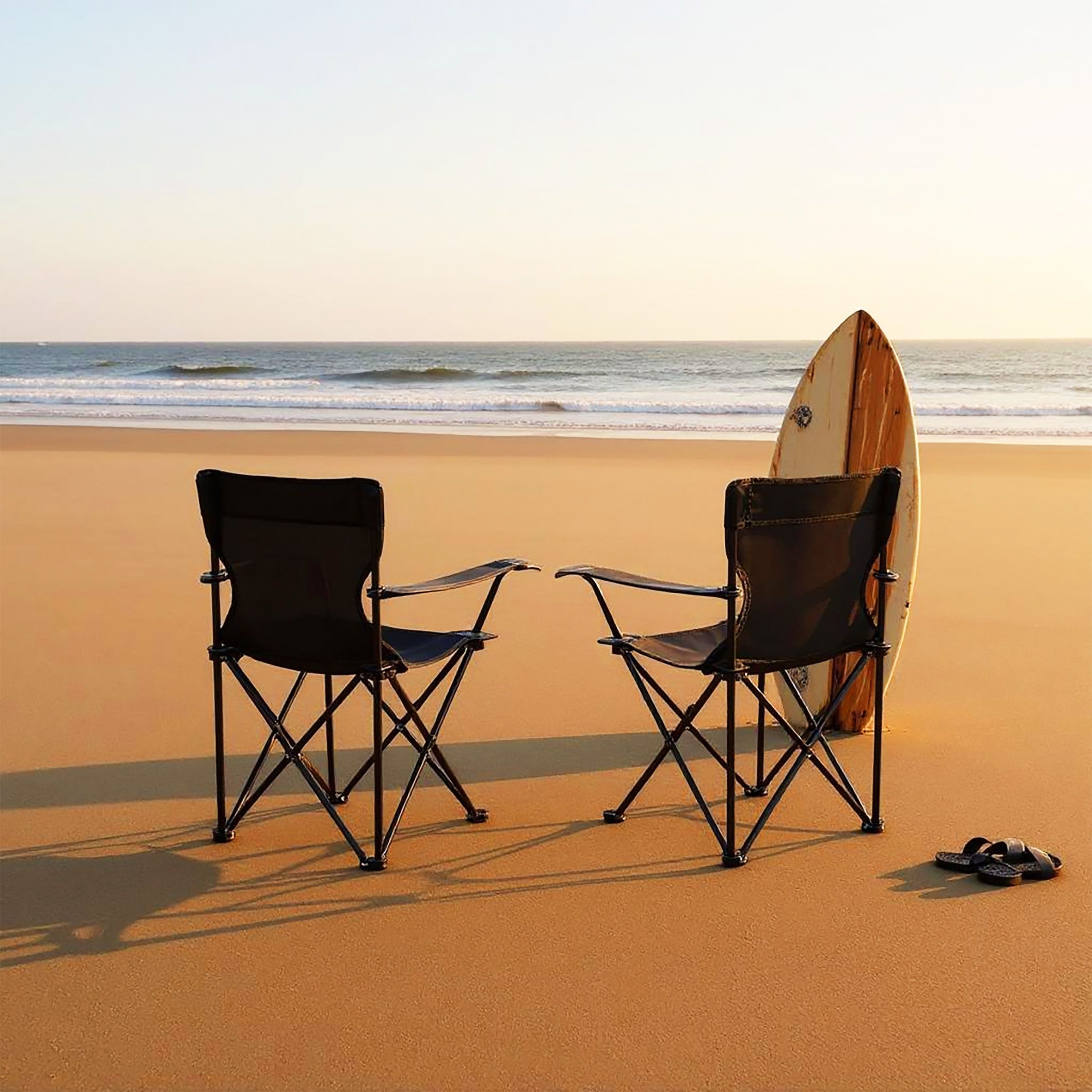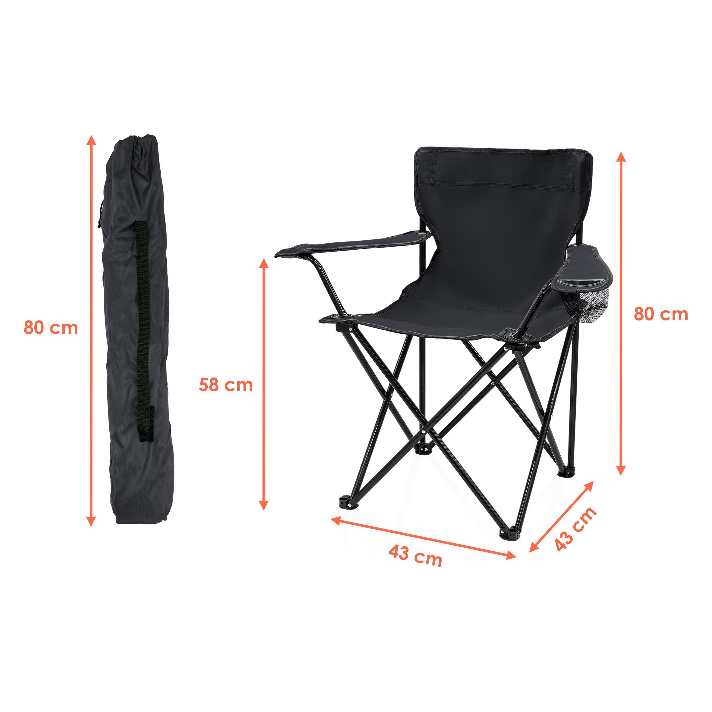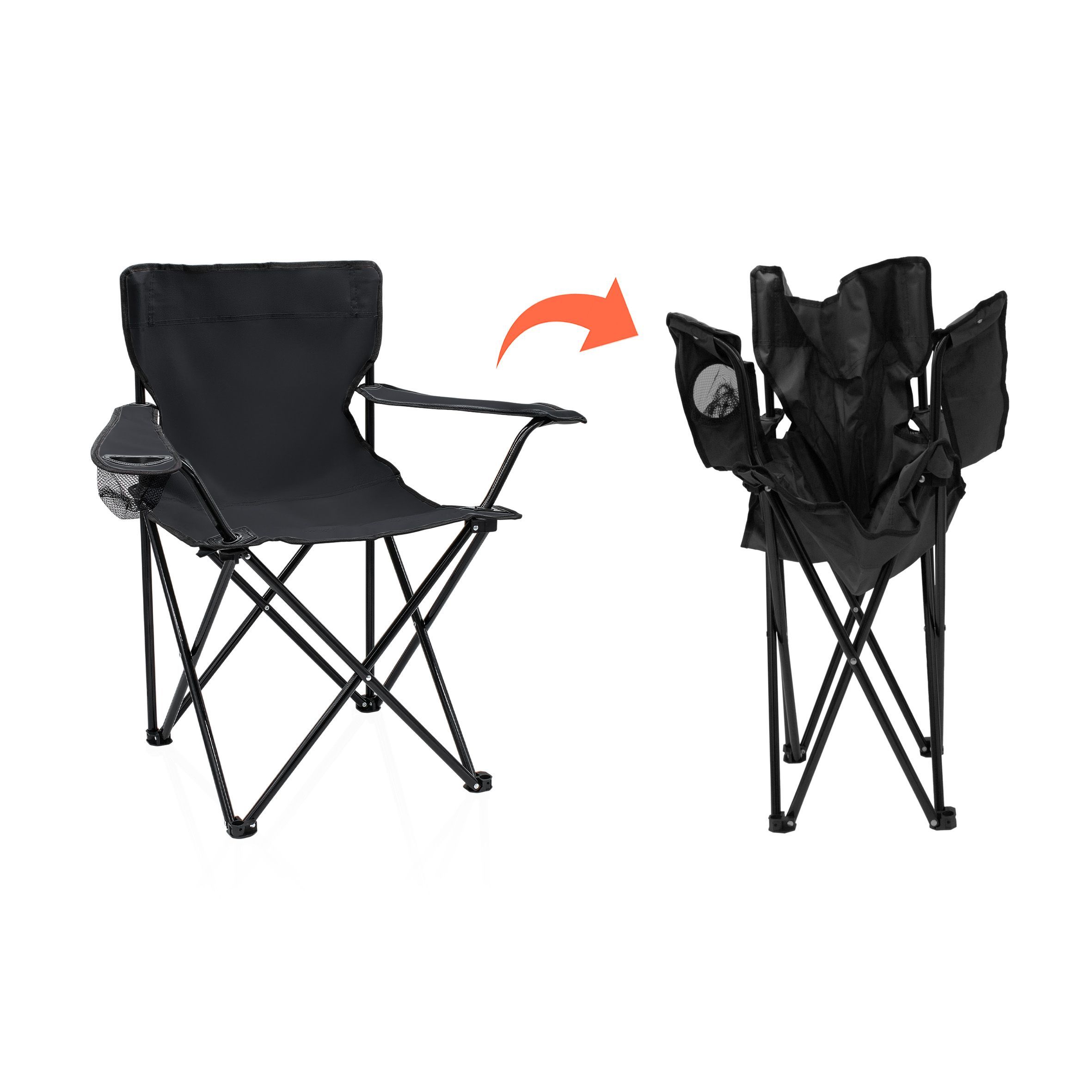 Klappbarer Campingstuhl in schwarz mit Getränkehalter und Tragetasche