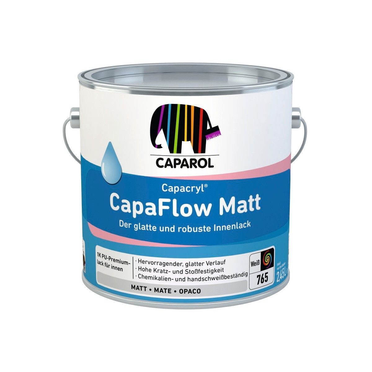 Caparol Capacryl CapaFlow Matt 2,45 Liter weiß Details für Capacryl CapaFlow Matt 2,45 Liter weiß: Der glatte und robuste Innenlack Verwendungszweck: Wasserverdünnbarer 1K PU-Premiumlack für robuste und extrem glatte Zwischen- und Schlusslackierungen auf maßhaltigen Holzbauteilen sowie auf grundiert