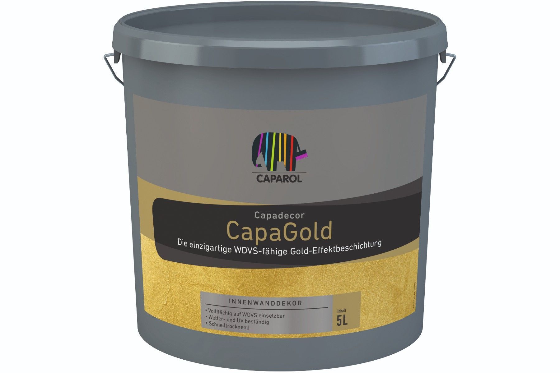 Caparol Capadecor CapaGold 2,5 Liter Details für Capadecor CapaGold 2,5 Liter: Seidenglänzende Acrylat-Dispersionsfarbe mit goldenem silbernem Metalleffekt für innen und außen. Verwendungszweck: Die Effektbeschichtungen CapaGold und CapaSilber sorgen zusammen mit der Spezialgrundierung EffektGrund i