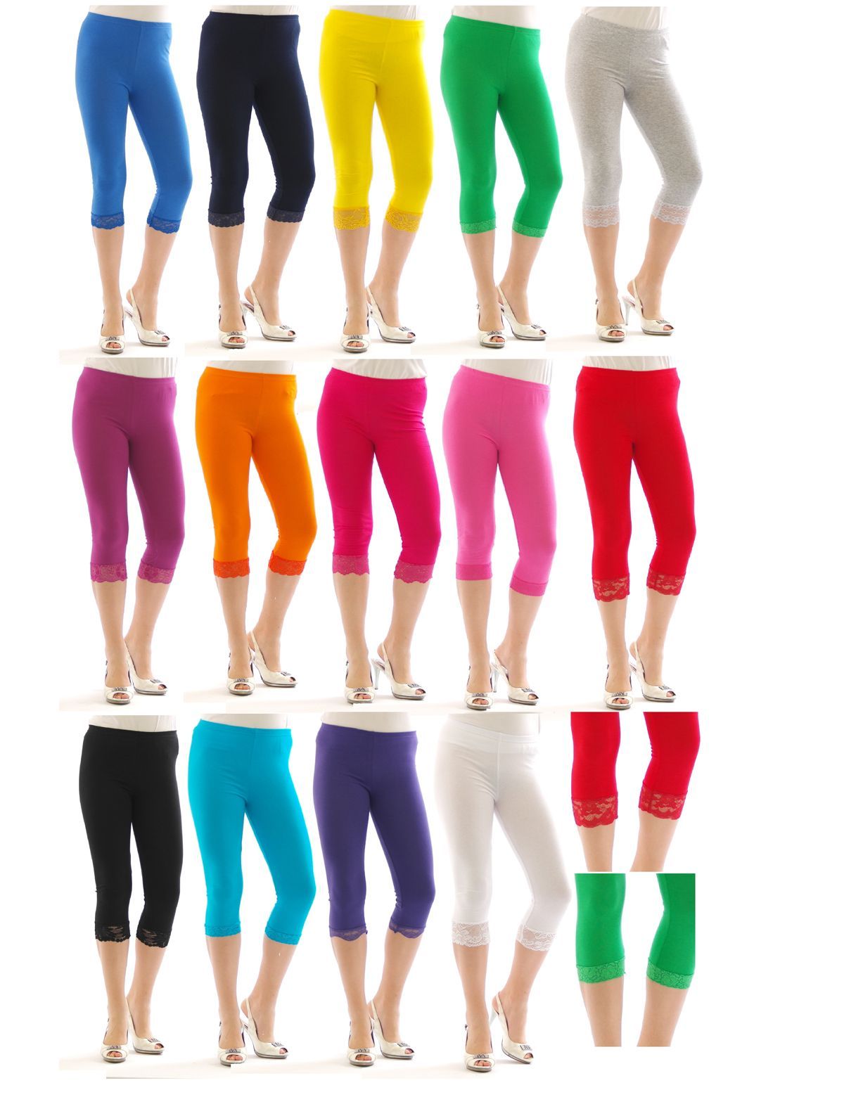 Damen Capri Leggings mit Spitze •Modell: Leggings •Größen zur Auswahl: S, M, L, XL, XXL, XXXL •Farben: Schwarz, Blau, Rosa, Pink, Weiß, Lila, Grün, Orange, Dunkelblau, Hellgrau, Türkis, Rot •Material: 95% Baumwolle, 5% Elasthan Verschiedene Farben stehen zur Auswahl. Spitzenmuste... Mehr