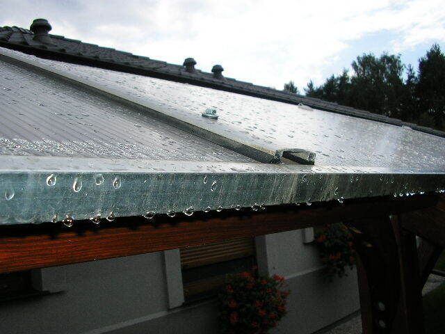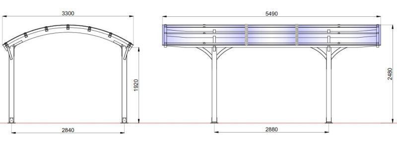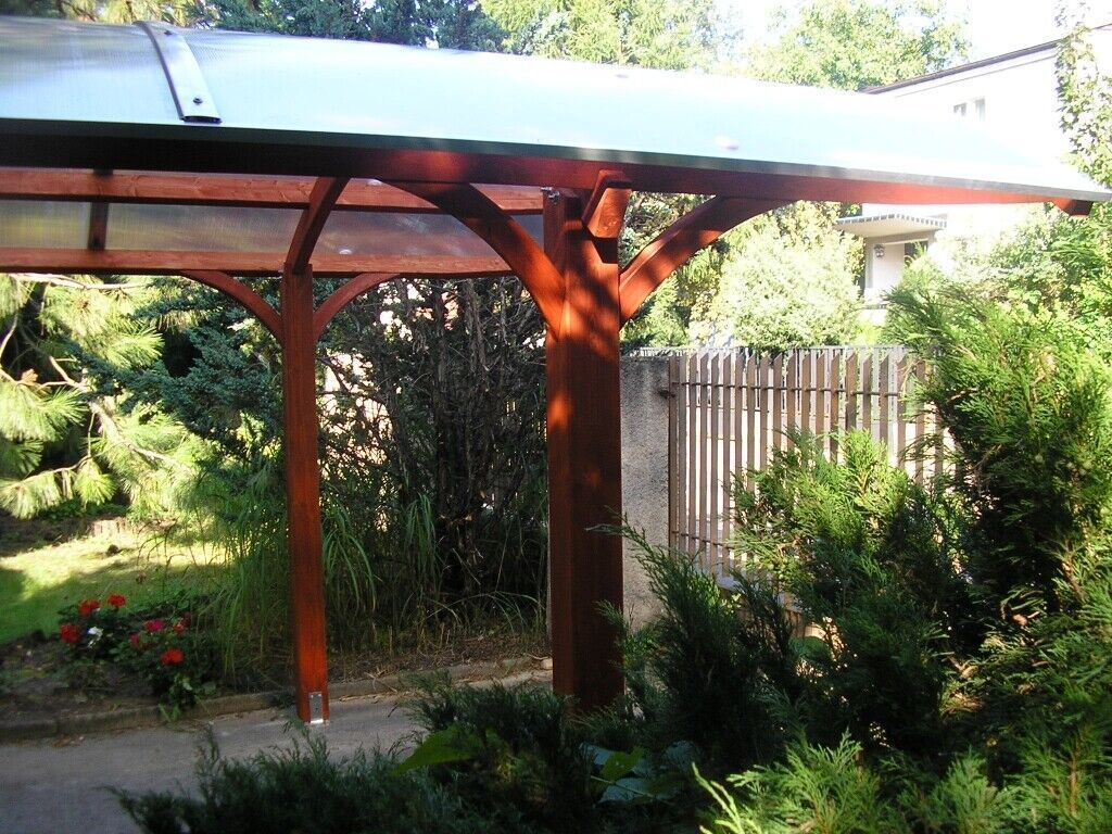 Carport Terrassendach aus Leimholz Breite 3,35 m Tiefe 5,4 m, 10 mm Doppelstegplatten. Unser Carport kann an sämtlichen flachen Flächen angebaut werden, die moderne Alternative zu traditionellen Garage und dient dazu, Ihr Auto oder Mororrad vor Regen, Schnee, fallenden Blättern, Nadeln, und Sonnenst