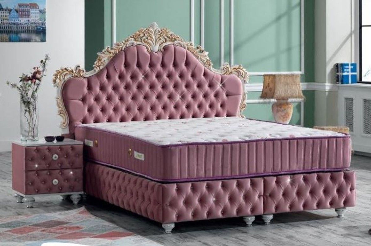 Casa Padrino Barock Doppelbett Rosa / Weiß / Antik Gold - Prunkvolles Samt Bett mit G