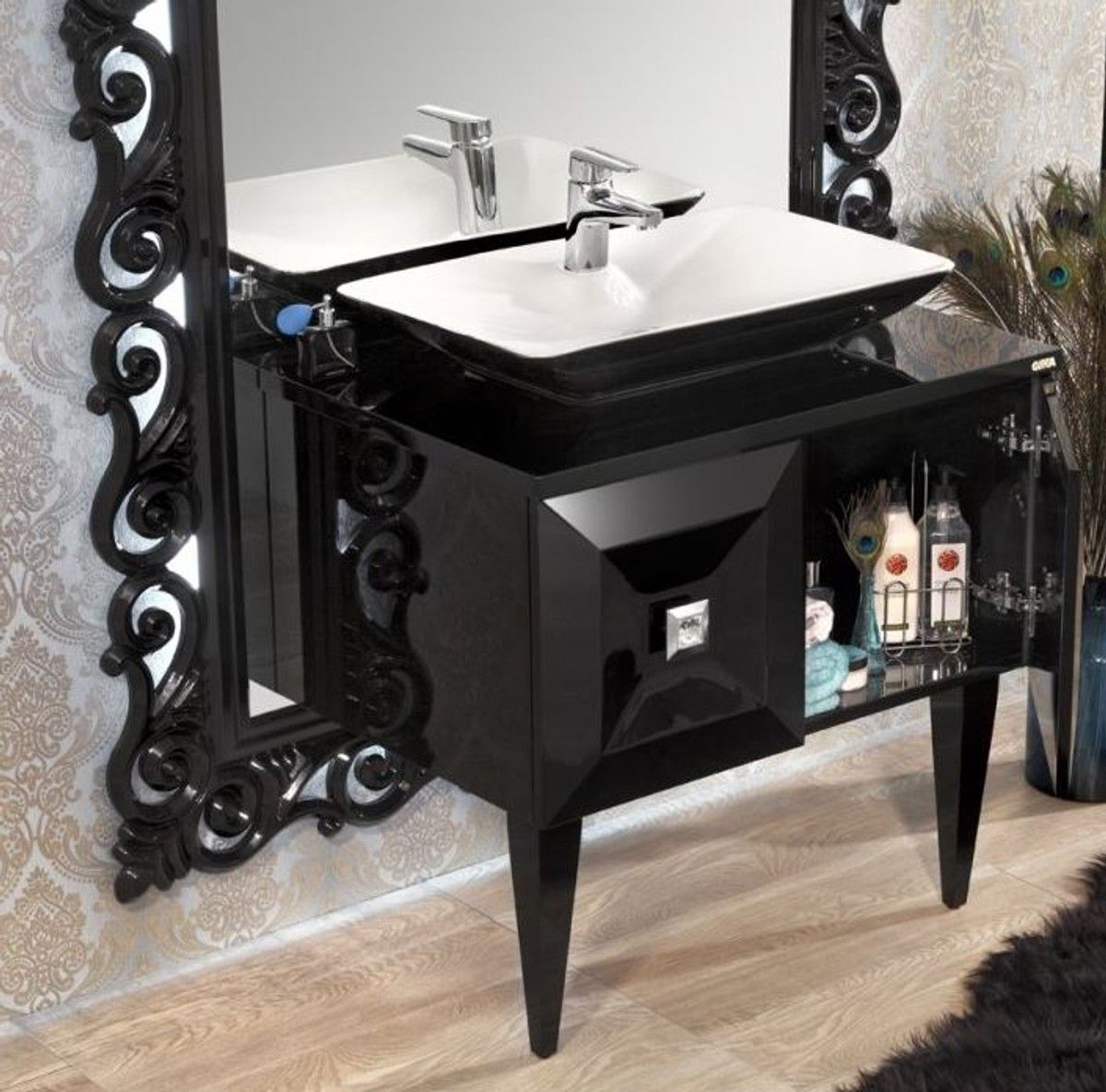 Casa Padrino Luxus Barock Badezimmer Set Schwarz - Waschtisch mit Waschbecken und Wan