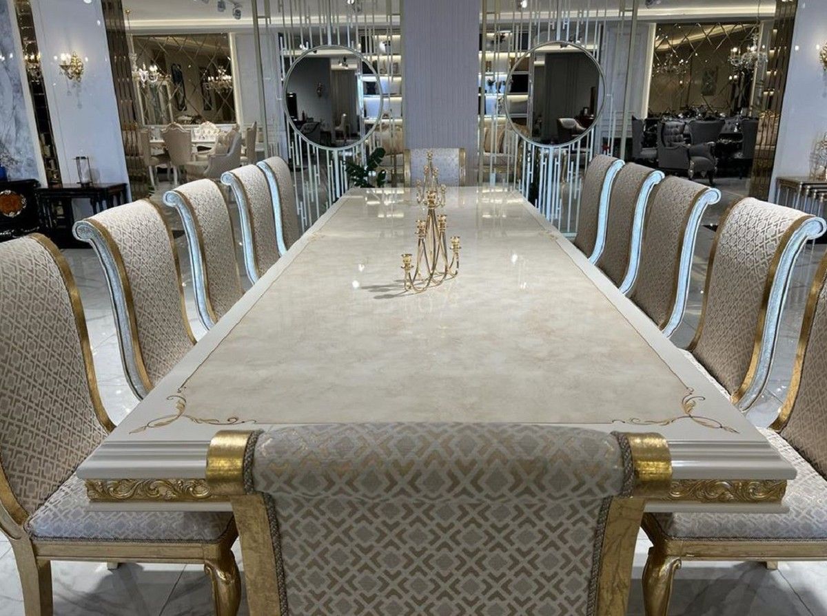Casa Padrino Luxus Barock Esstisch Weiß / Gold - Handgefertigter Massivholz Esszimmer