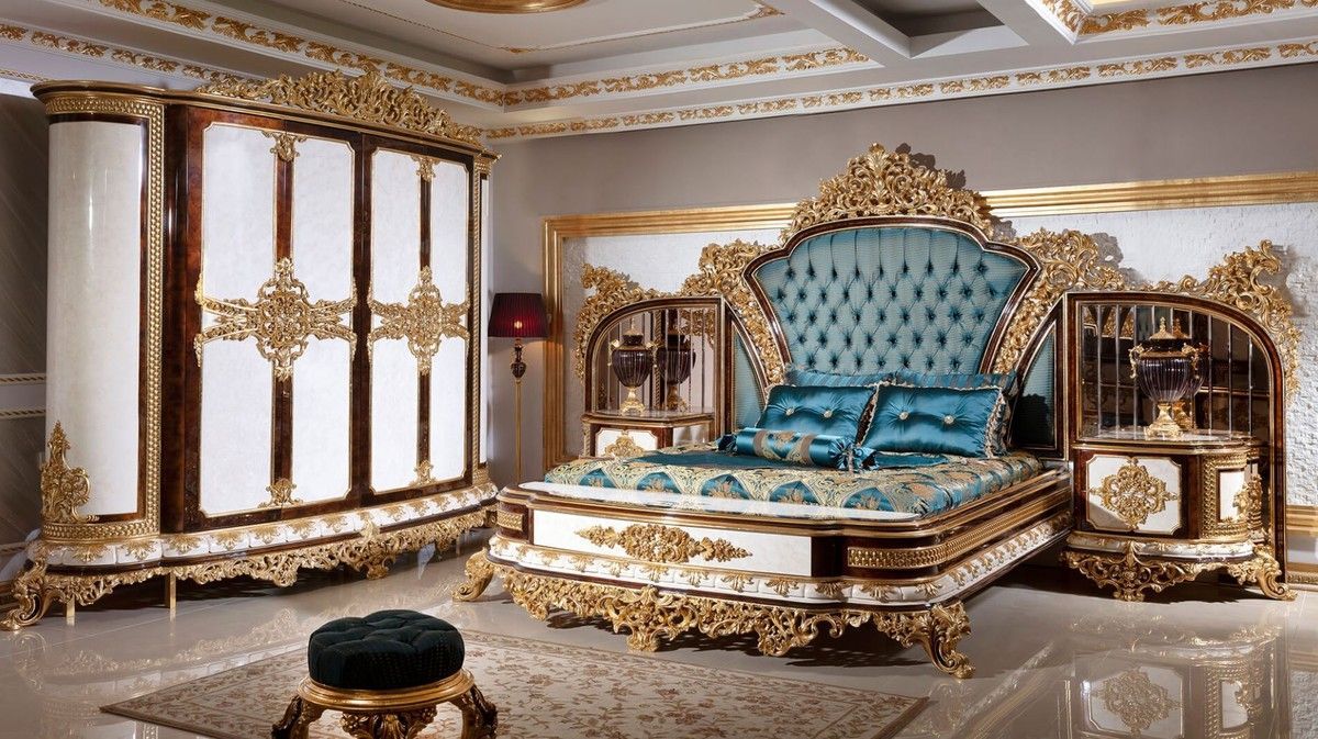 Casa Padrino Luxus Barock Schlafzimmer Set Blau / Weiß / Braun / Gold - 1 Doppelbett