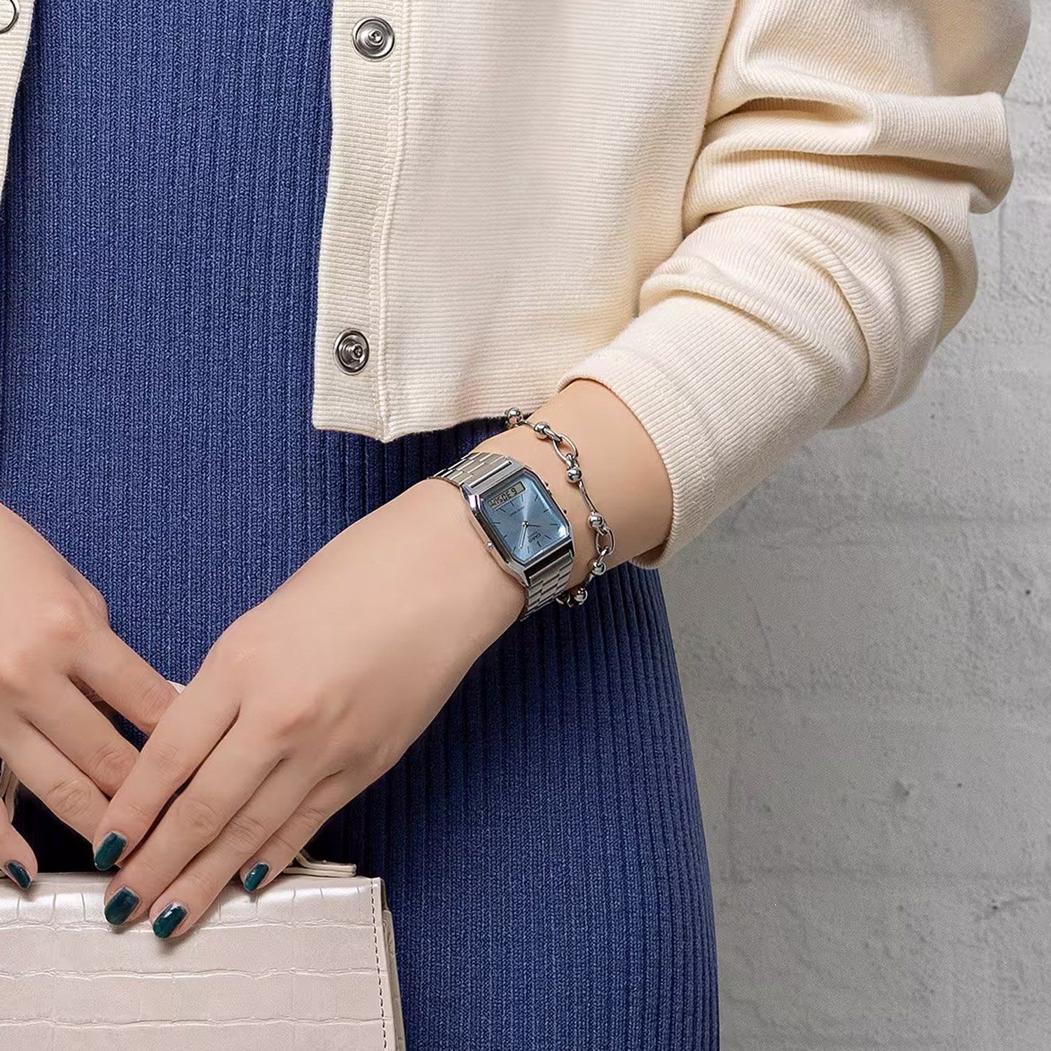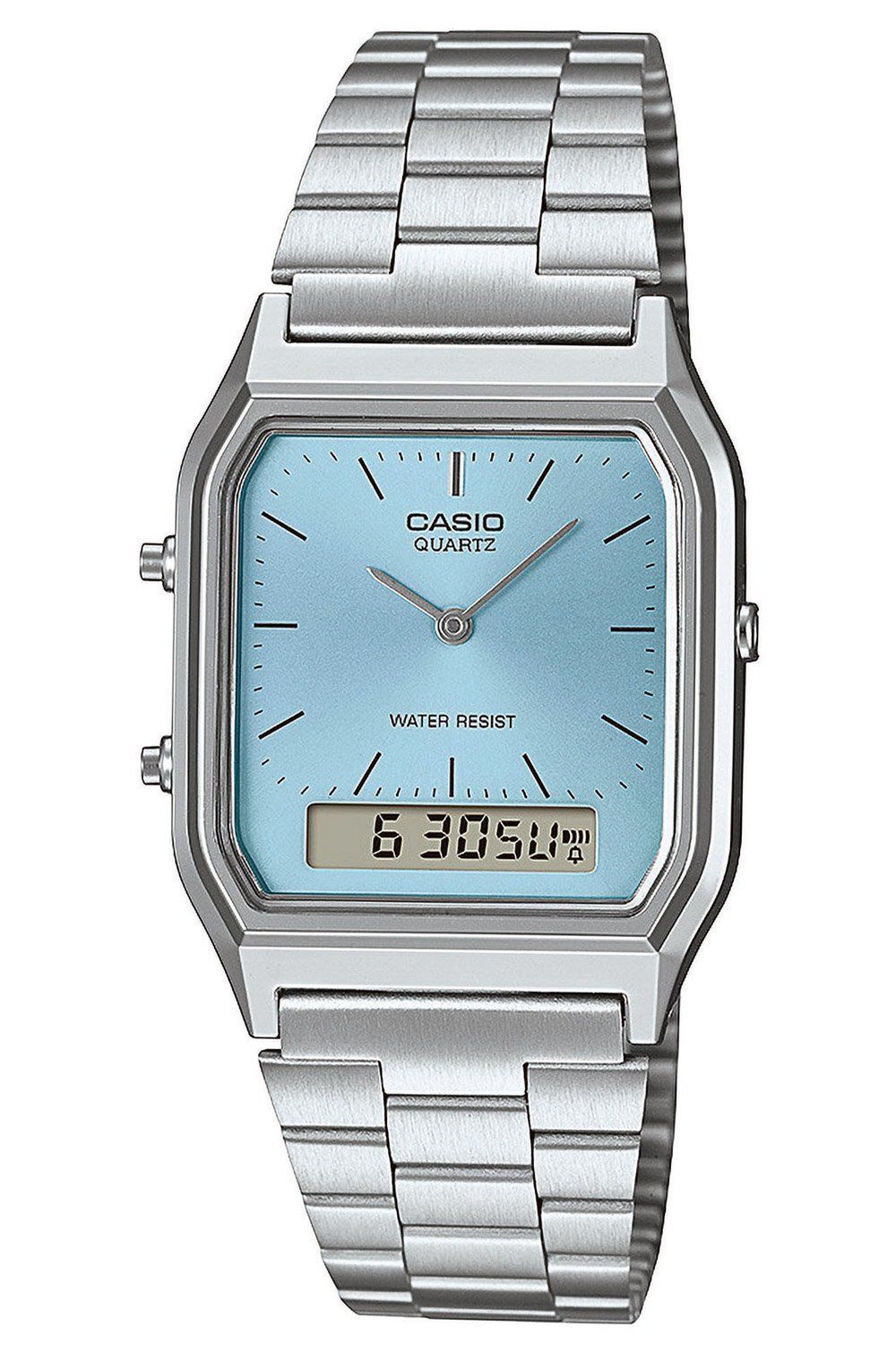 lässige Uhr in Unisexgröße mit einem batteriebetriebenen Quarzwerk, analoge und zweite digitale Anzeige der Uhrzeit, automatischer Kalender mit Datum, Monat und Wochentag, 12-/24-Stunden-Format, Stoppfunktion bis zu 1 Stunde in 1/100 Sekundenschritten, Tagesalarm, hellblaues Sunray-Zifferblatt, silberfarbene Zeiger, schwarze Indizes, Gehäuse aus verchromten Resin, Acrylglas, Armband aus mattiertem Edelstahl, längenverstellbare Klappschließe mit Logogravur, spritzwassergeschützt, Größe 38,8 x 29,