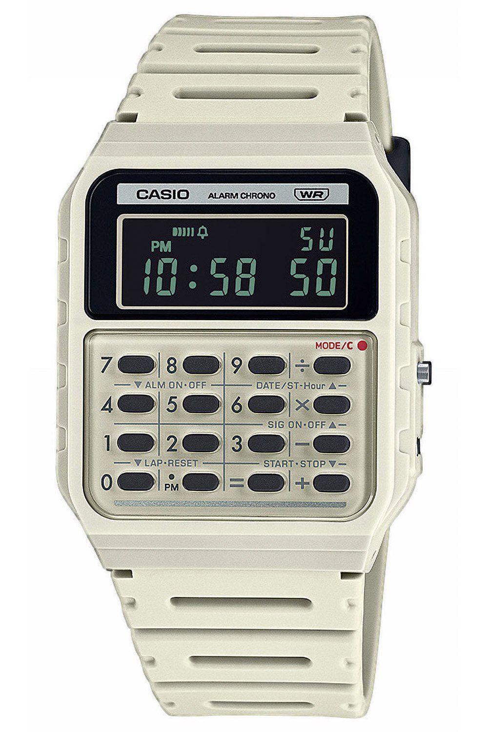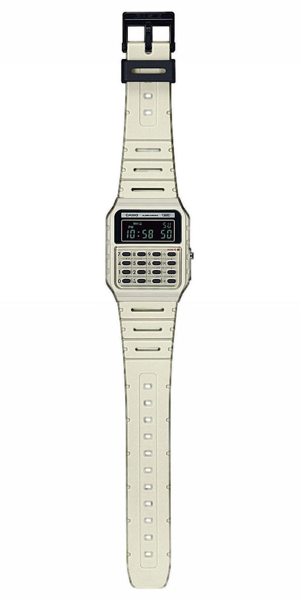 schicke Uhr mit Taschenrechner, aus der Casio Vintage Kollektion, Anzeige von Stunde, Minute und Sekunde, automatischer Kalender mit Datum, Monat und Wochentag, zeigt einmal eingestellt immer das richtige Datum an, zweite Zeitzone, Stoppfunktion bis zu 24 Stunden in 1/100 Sekundenschritten, Tagesalarm für täglich wiederkehrende Ereignisse, Tastentöne ein/aus, Gehäuse aus rohweißem Resin, geschraubter Edelstahl-Gehäuseboden, Acrylglas, hellbeiges Armband aus biobasiertem Resin, Dornschließe, wass