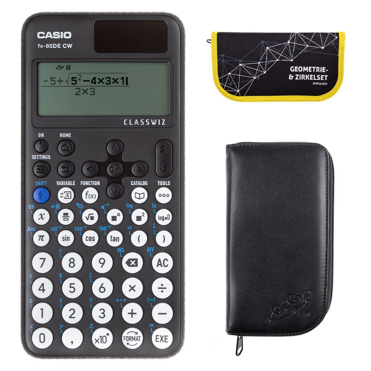 Casio FX-85 DE CW mit schwarzer Tasche und Zirkelset gelb