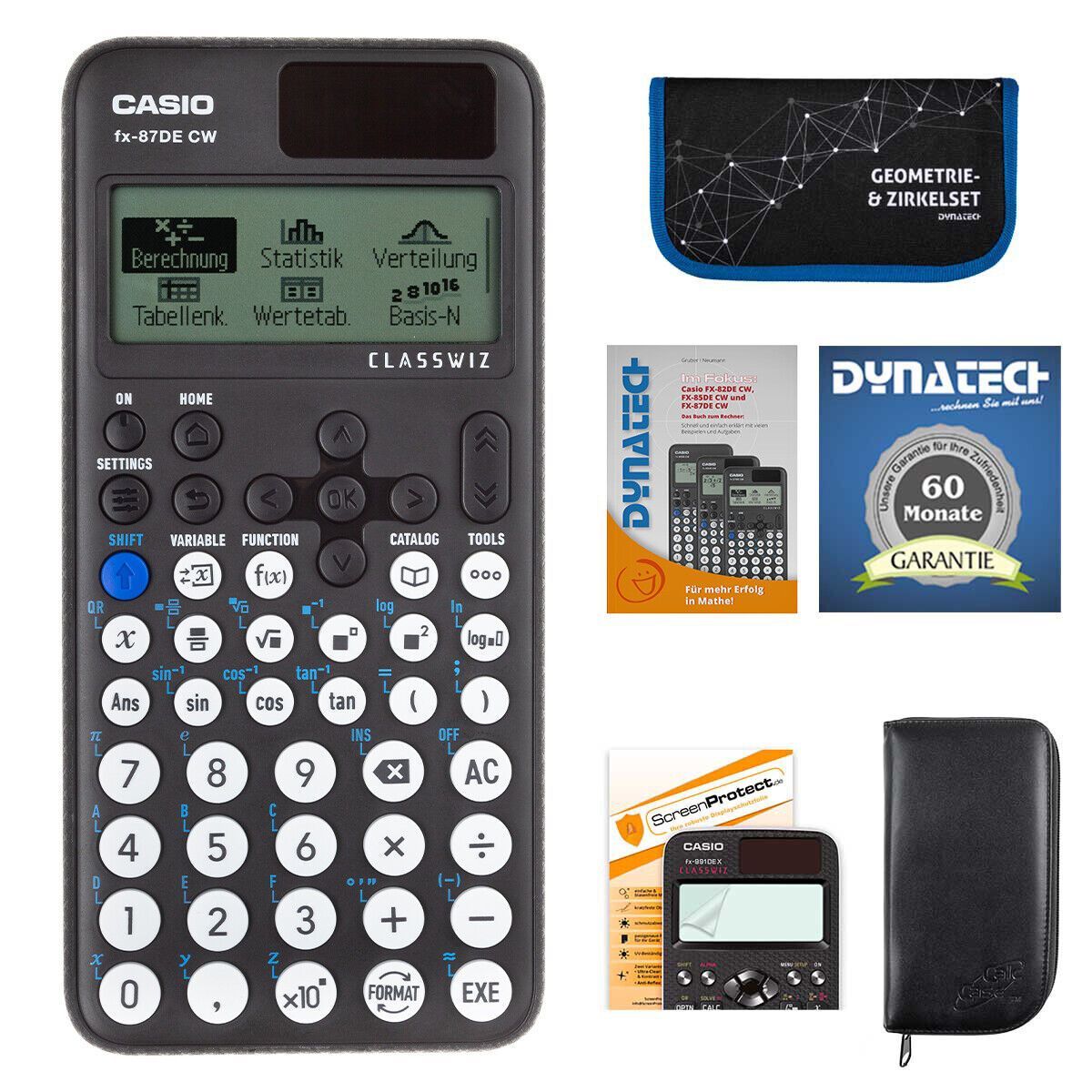 Casio FX-87 DE CW mit schwarzer Tasche, Zirkelset blau, Folie, Buch, Garantie