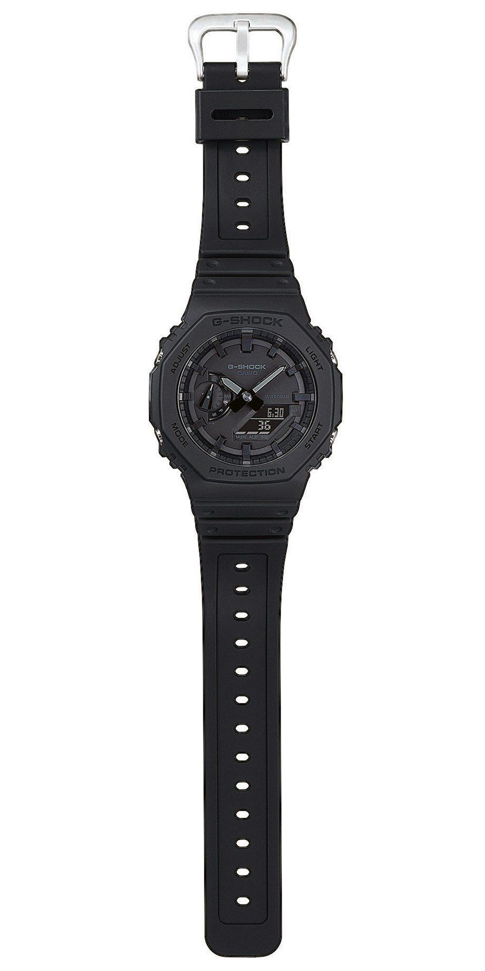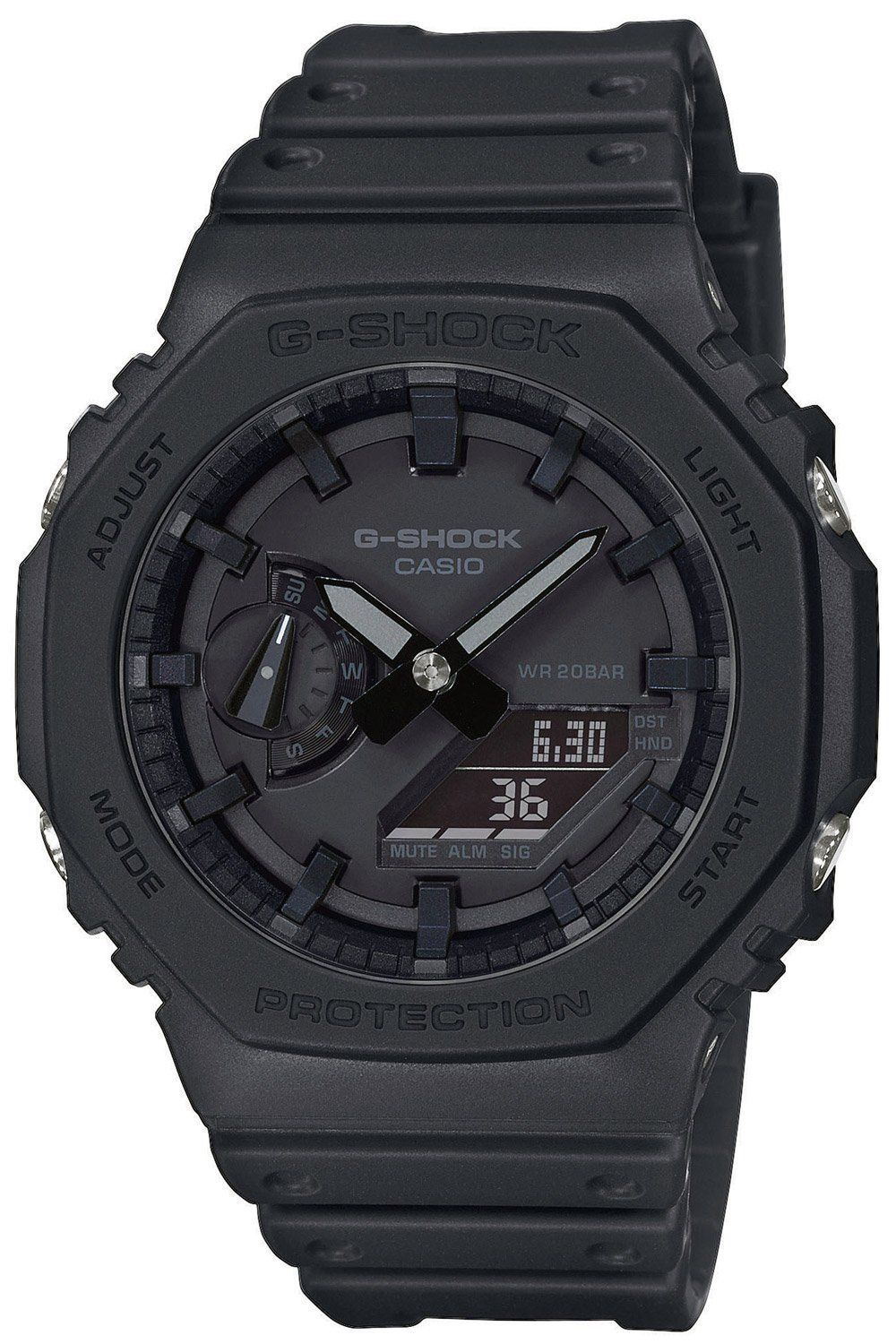 stoßfeste Retro-Style Uhr mit digitaler und analoger Zeitanzeige, batteriebetriebenes Quarzwerk, automatischer Kalender mit Datum, Monat und Wochentag, 12-/24-Stunden-Format, Weltzeitfunktion, Stoppfunktion bis 24 Stunden in 1/100 Sekunden, Countdown-Timer bis 24 Stunden in 1/1 Sekunden, 5 Tagesalarme, Tastentöne ein/aus, Hand Moving Funktion, schwarzes Zifferblatt mit erhabenen Indexen, Super Illuminator LED-Beleuchtung, schwarze lumineszierende Zeiger und Markierungen, schwarzes karbonverstärk